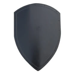 This black canvas is made from steel with a black finish so you can design and create a look of beauty. Fight under your own colors and win the fair maidens hand or maybe you are a maiden fighting for your own hand. In the center of the back is a steel handle running vertically with a faux leather wrap for comfort. The outer edge has a raised decorative border with steel rivets intermittently spaced around the entire shield. Overall Length: 25.75 Inches.