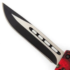 Feel just like the infamous Boogeyman himself. This smaller, more compact version of an OTF knife is exceptional for hunting, camping, every day, military use, or whatever revenge you are seeking. The black and metallic silver dagger point blade is made from stainless steel with a blood groove running down the center. 4 cutout holes are sported on the blade for added detail. A simple matte black coated handle stealthily conceals the blade, which is released by the firing button on the side. A steel pocket clip is mounted on the back of the handle, with a glass breaker on the bottom that makes you well-equipped for any serious situation. These knives feature an improved internal mechanism for more consistent firing. Overall Length (Blade Out): 6 5/8 inches
