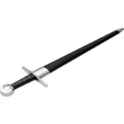 This Knightly sword is made from EN45 high carbon steel with a straight cruciform cross-guard and circular pommel. The grip surrounding the full tang is wood that has been wrapped in genuine black leather. A shallow fuller runs down the middle almost the entire length of the blade. This sword is full tang and battle ready with a peened pommel. Peening is the method historically used for most of the pre-industrial era. It fixes the pommel permanently to the tang. This durable blade is strong and ready for re-enactments or tournaments. Included is a wooden scabbard with a rexin wrap and steel locket and chape. Finish off a costume or star in a play with this amazing historical replica. Overall Length: 37.75 Inches.
