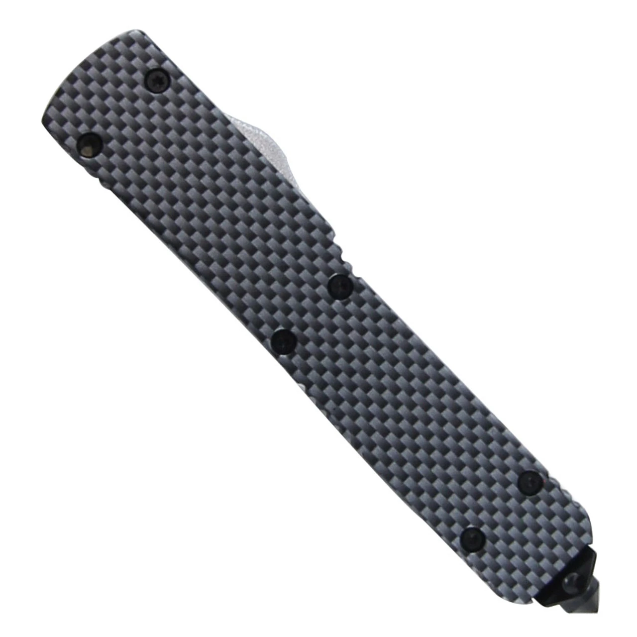 The blade of this expertly-crafted knife is forged from stainless steel with a two-tone finish and tanto style. Tantos are great because they give that extra cutting edge. Circular fullers run half along the center of the knife with a tank tread spine. The carbon fiber finish of the zinc alloy handle adds just the right amount of sleekness to this killer beauty. The glass breaker on the end of the handle is just another reason to add this tactical tanto to your arsenal. To top it all off, a free nylon carrying case is included. Overall Length: 8.38 Inches