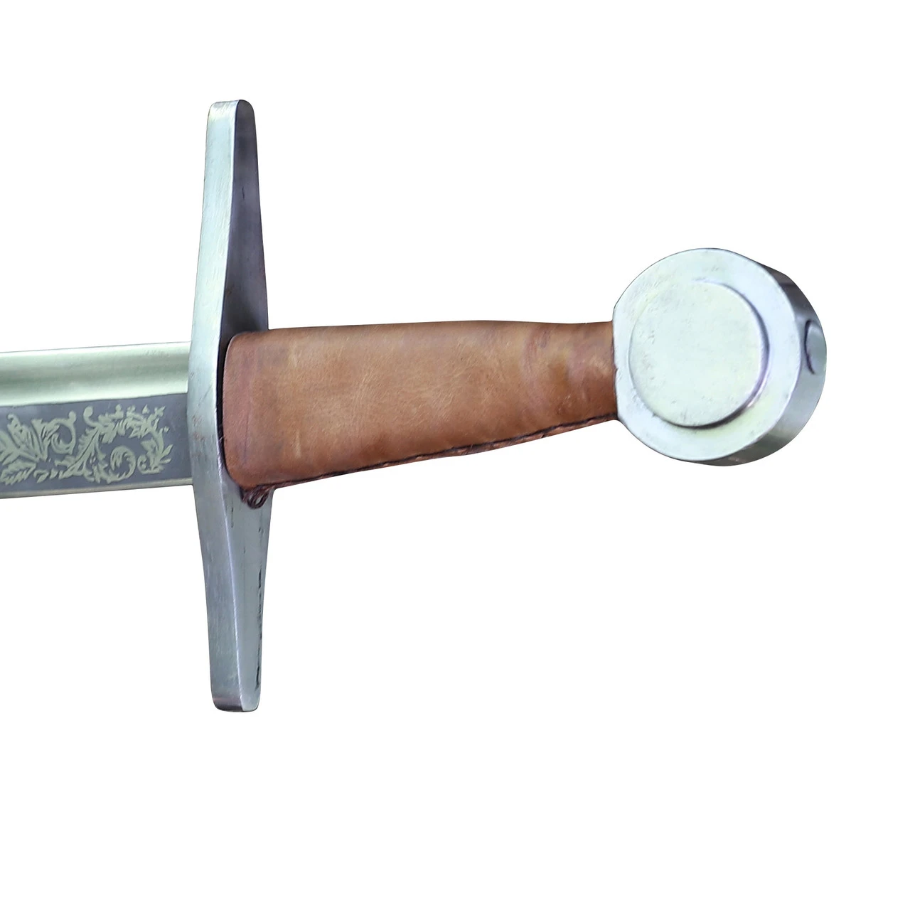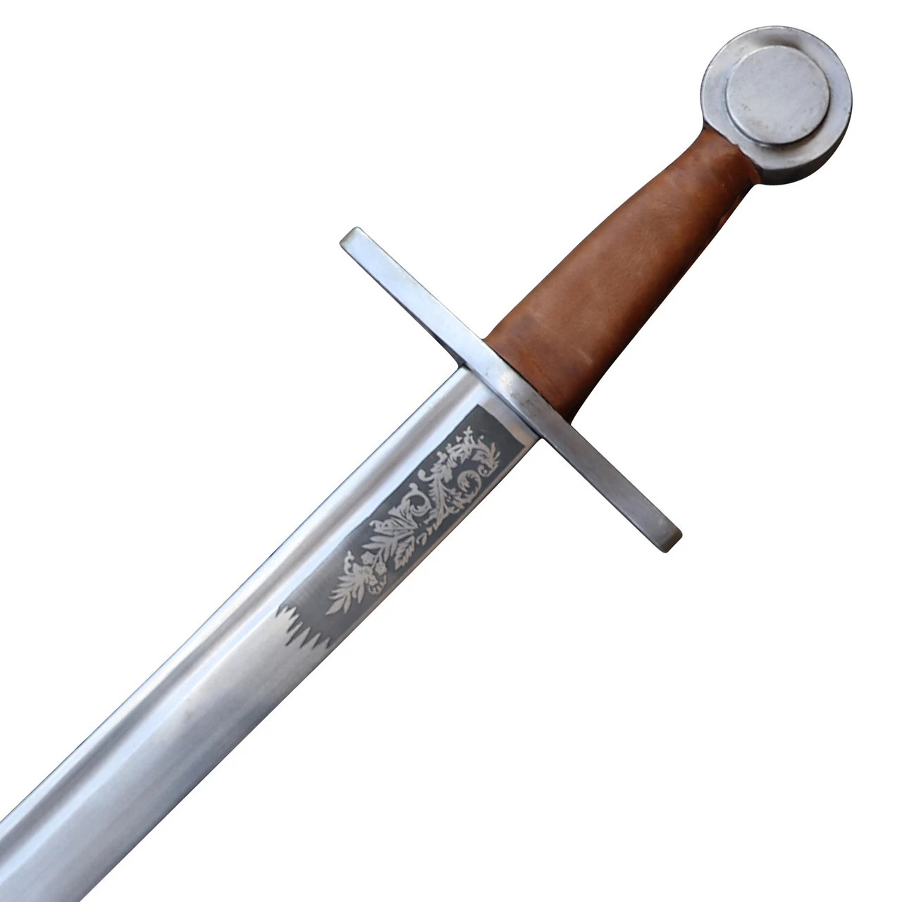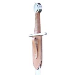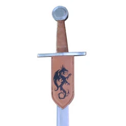 This robustly built and impressive falchion brought you by Armory Replicas is just a monster of sturdiness that will resist even the very worse of the rigors of full-contact or Buhurt fights. The blade is made of a thick and well-tempered flexible EN45 high carbon spring steel with appropriate blunted edges that maintain the required thickness throughout. This emphasis on weight, balance and proper distal taper allows for a robust weapon that nevertheless keeps excellent thrusting ability mixed with surprisingly fast cuts. Its cross guard and pommel are made of solid steel and are directly welded to a wide and sturdy tang for a nearly indestructible overall construction. This beast doesn’t only hit hard and is seemingly unbreakable, but IT ALSO JUST LOOKS DAMN COOL! The grip is finished with high quality leather and the blade is expertly etched with impressive floral designs that would immediately catch the eye of any connoisseur. Not only that but the falchion is also provided with a FREE matching genuine leather holder displaying a magnificent dragon design!!! Everyone LOVES falchions for their convenience and practicality, especially in heavy fight and group fight where their shortened blade with an impressive strike force is a perfect weapon for close combat. But here you have the perfect alliance of brute force and pure elegance!