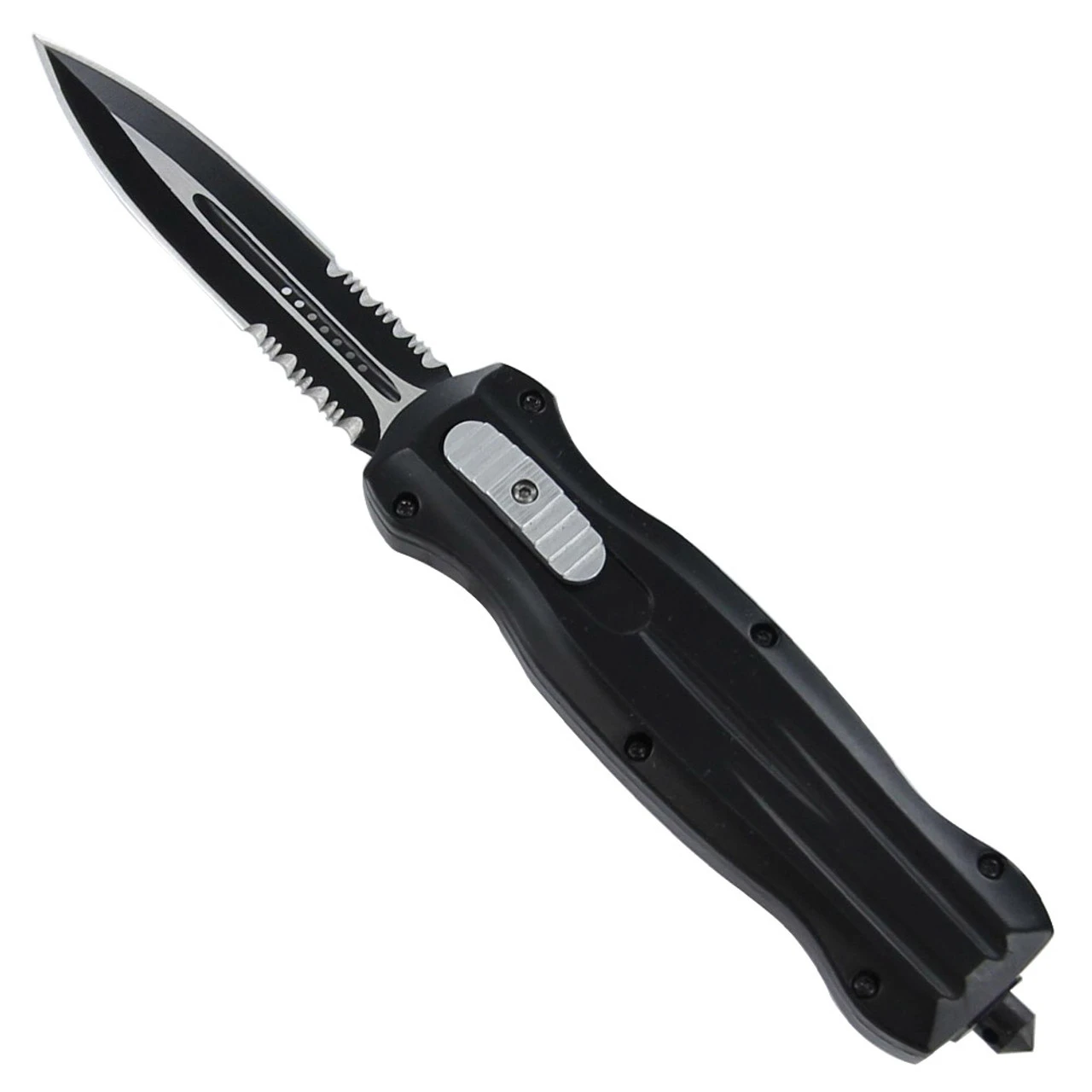 The broad handle width measures a full 1.25 inches plus it is 5.38 inches long.The casing in made from a zinc alloy giving it the durability you need in a pocket knife. The slide is located on the top of the handle near the blade. Moving it forwards and backwards activates the spring for easy deployment. With the dual action of this blade you are able to open and close this knife with a few quick motions. This spear point is stainless steel with a two-tone finish with a partial serration on both sides. At the end just waiting to strike is a punch for cracking skulls or I guess you can use it for car accidents and other emergencies too. Transporting a blade has never been easier as it comes with a steel pocket clip.Overall Length: 9 Inches.