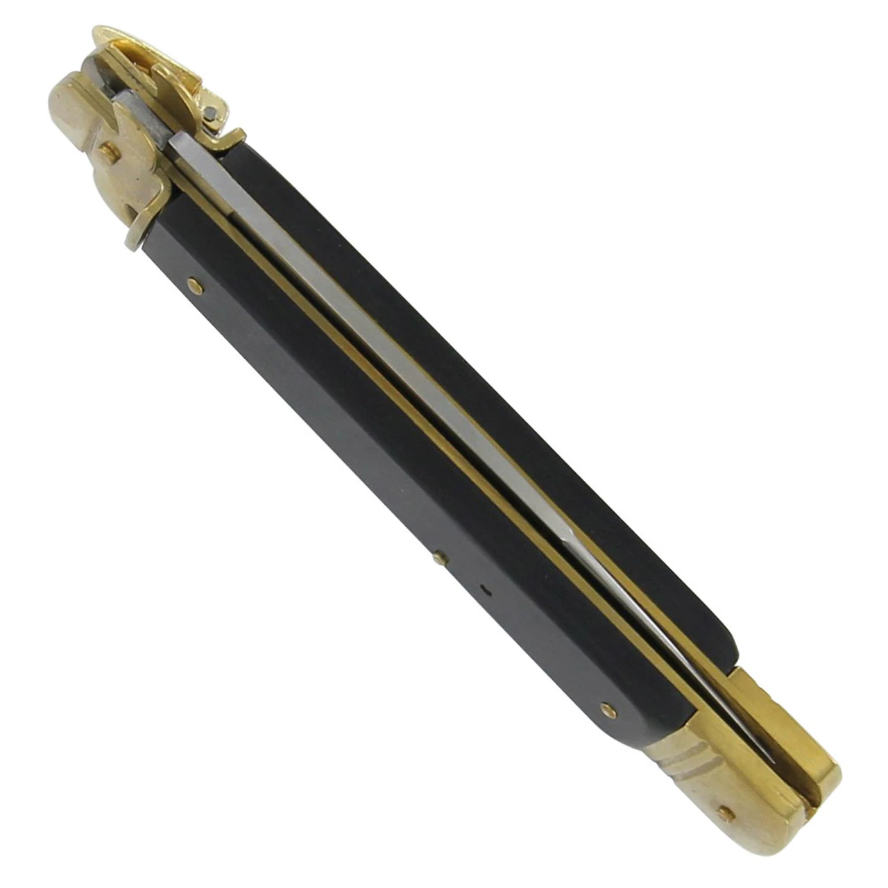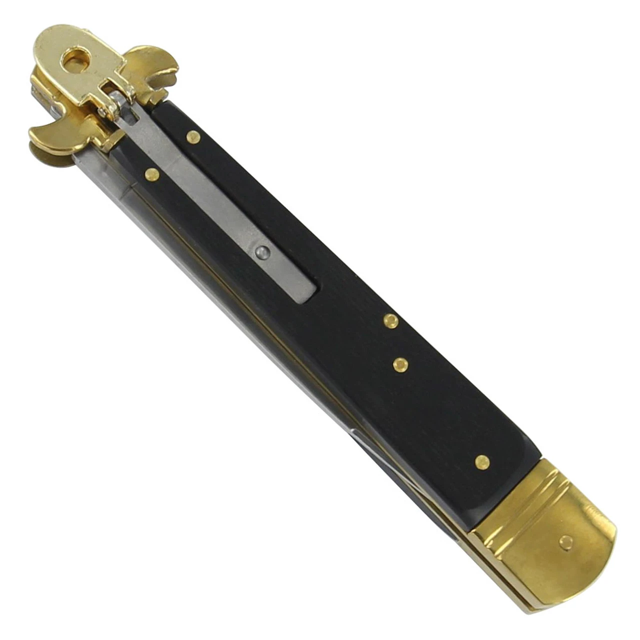 This knife is a whopping 9.75 inches in length and 4.25 inches of this is the blade. The blade is made from stainless steel with a drop point blade that comes extremely sharp. The handle has wood mounts with an ebony finish. The golden bolsters and frame are also stainless steel. Now here comes the important part, the lever opening mechanism and lock; fold it backwards and press the release. Just watch that baby fly. Push the lever upwards to lock the blade. Included is a nylon sheath with belt loop Overall Length: 9.75 Inches.