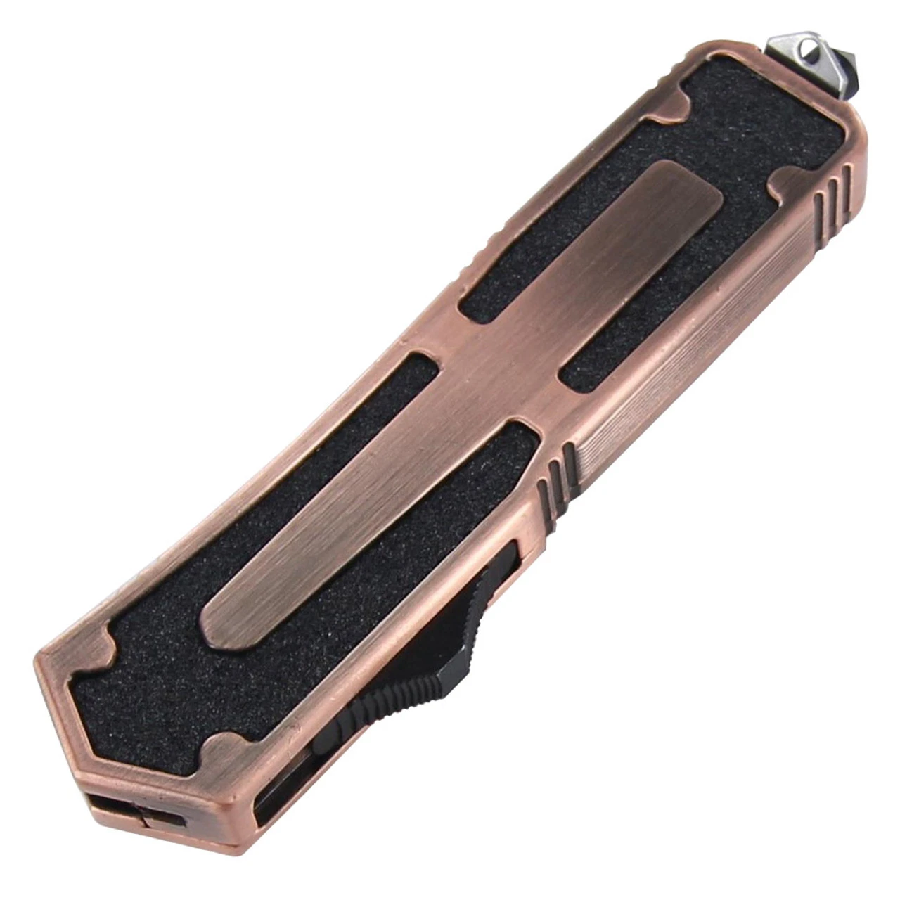 This drop point blade is made from stainless steel with a two-tone finish. The grip is made from zinc alloy in brushed copper that is contoured for a comfortable grip. There are sand paper inserts for working in wet conditions. A glass breaker is featured end of the handle with a steel pocket clip. The ease of use is attributable solely to having a mechanism that both deploys and retracts the blade so that you dont need to do it manually. This saves time, and it also means the knife is very easy to use. Their single-button deployment and retraction mechanism makes them well-suited to outdoor adventures and DIY tasks that might require you to have one hand free to work while the other operates the knife. Also included is a quick release nylon sheath too.Overall Length: 8.50 Inches