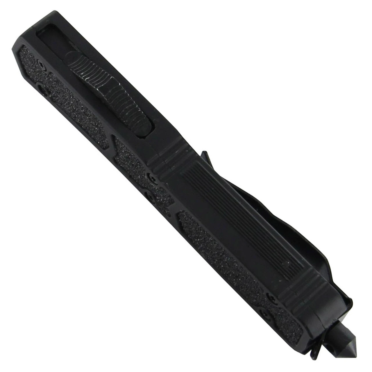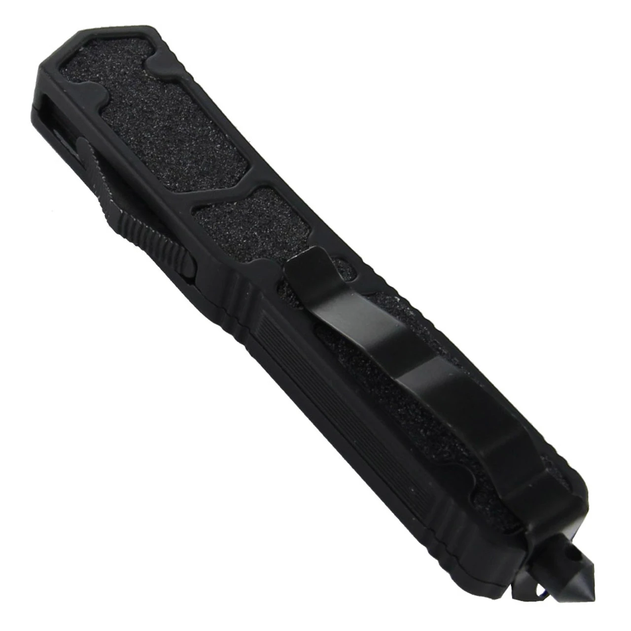 Popularity in OTF knives have been a constant. It seems they never go out of style. I may be due to the ease of use or the fact that they are quite neat in overall design and function. This beauty is no exception. The two tone blade is made from stainless steel with almost the entire blade having an anodized finish. The handle has a zinc alloy casing with a sandpaper texture for working in wet conditions. The slider is located on the side to propel the blade forward and retract. The dual action function is a popular feature on OTF knives. A glass breaker completes the butt just in case of emergencies. Included are a steel pocket clip and a quick release nylon sheath. Overall Length: 8.5 Inches