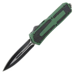 It is large with a stainless steel blade. The blade features a fuller running down the center and a two-tone finish. Edged on both sides, making it a great thrusting or stabbing knife; perfect for close combat situations. The handle is made from zinc alloy with black sand paper grip inserts. This detail allows you to still work with your knife in wet conditions. The slider is located on the side and can move the blade in and out flawlessly. This dual action feature is a fan favorite. Foe emergencies this blade is equipped with a glass break. For different ways of transporting this knife a pocket clip and a quick release nylon sheath is provided.Overall Length: 8.5 Inches