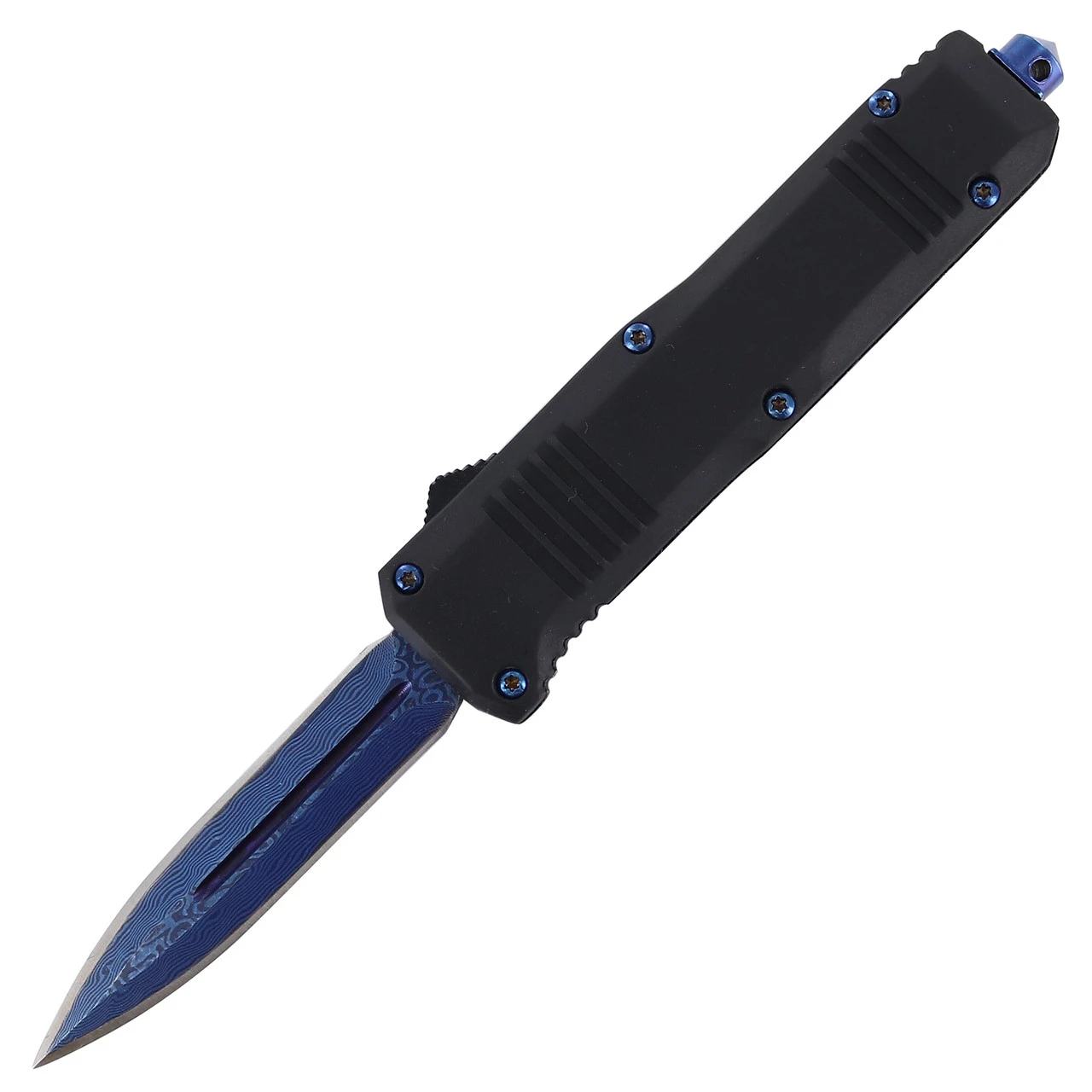 It seems that our Azurites Edge has caught your eye. Thats not only because of the Damascus steel blade in a spear point style, but also because of the lovely deep azurite blue color that is on the blade as well as the 6 sturdy screws, the handy emergency glass breaker, and on the pocket clip that is located on the handle. The handle itself is made of sturdy zinc alloy with a nice-feeling matte black finish. The Damascus steel is made from 1095/15N20 steel with a beautiful blue wave-like pattern. There are approximately 176-180 blade layers with a temper of 54 to 60. There are countless benefits when it comes to an automatic knife. With Out the Front knives especially, you only need the push of a button to eject and retract your blade from the top of the handle, making them incredibly easy to deploy. Theyre also fast acting, so theyre perfect for emergency situations. It goes without saying that theyre also quite cool looking. Included with your knife if a free durable nylon sheath so you can carry your blade in style.