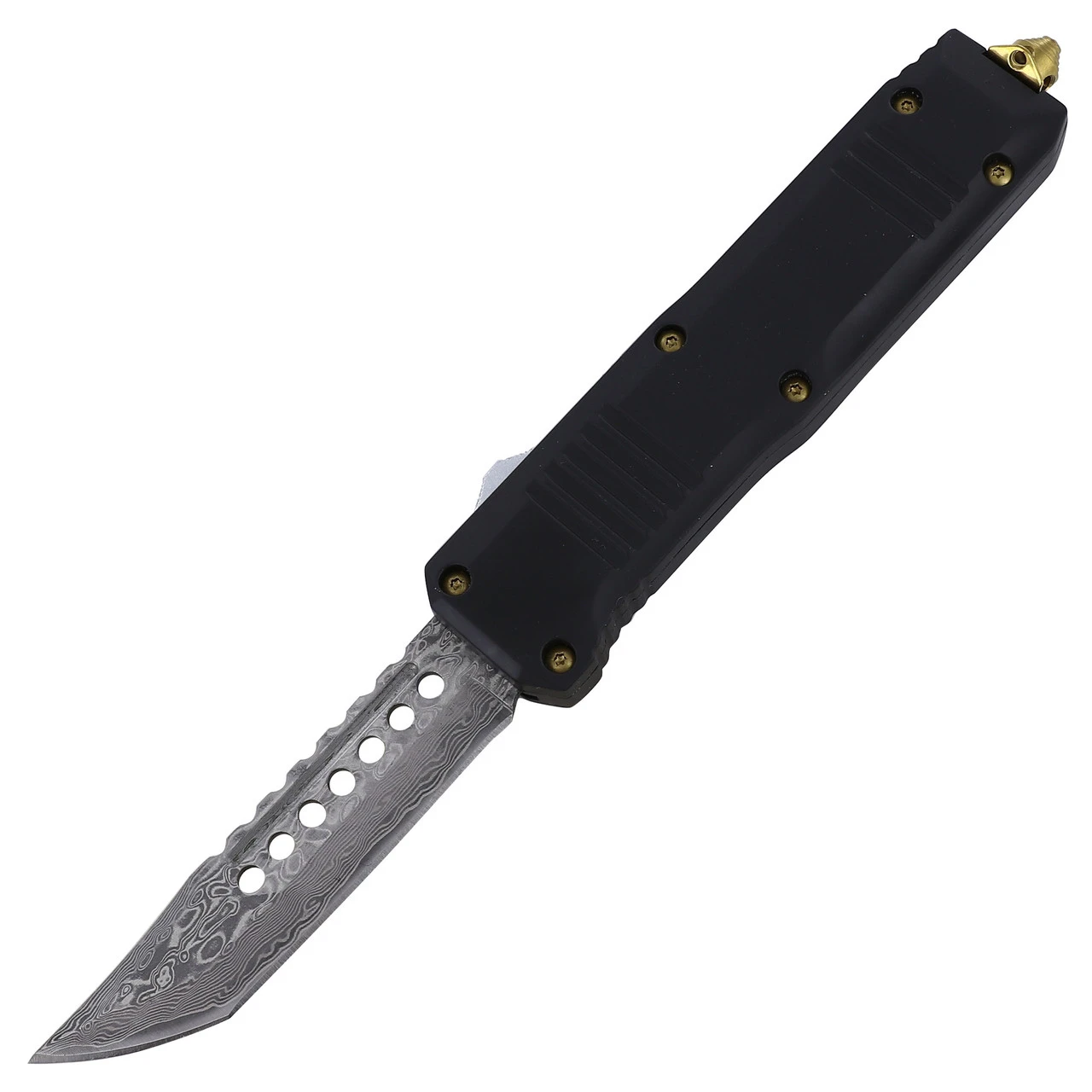 This exquisite automatic dual action out the front knife is sure to catch your eye. The blade is made from 1095/15N20 Steels to create a gorgeous wave-pattern Damascus. The blade features a ridge back design with 7 holes cut out to reduce weight and add a neat touch. When not in use, the blade is encased in the matte black zinc alloy handle. Use the silver switch on the side of the handle to deploy and retract the blade with ease. The six sturdy hex screws holding the handle together, as well as the trusty pocket clip and glass breaker on the handle are anodized for a gleaming golden finish. A black nylon sheath is included with a quick release closure. Overall Length: 9.5 inches, Blade Length: 3.75 inches