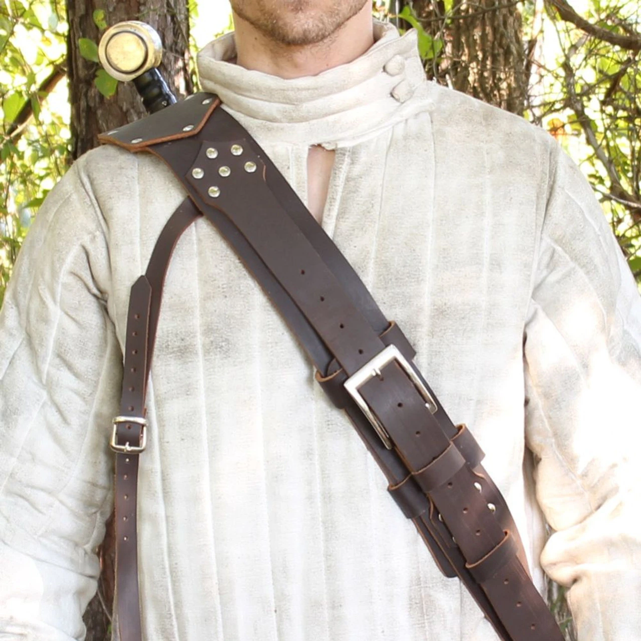 This Cheshire Knights Authentic Leather Baldric is constructed of genuine thick premium brown leather. It is made specifically for Long Swords or Claymores, but can fit most medieval swords. The shoulder strap is adjustable with steel buckles. An adjustable leather thong hangs down from the shoulder strap and attaches to your belt. The scabbard of the Baldric is adjustable and can be fitted to your sword length with buckles.