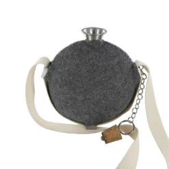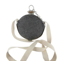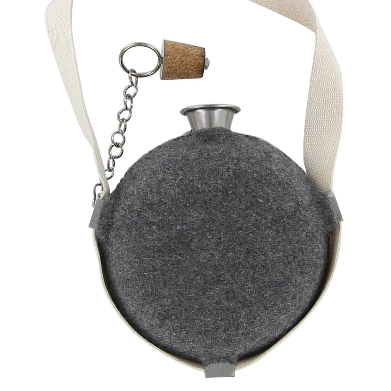 The outer material that covers this canteen is a gray woolen, or satinette, cloth that has been hand sewn. The actual canteen is made of stainless steel with a spout. The spout has a rolled lip with a soldered seam. Attached by a steel link chain is a cork stopper to keep all the contents from spilling out. A cotton drilling strap is fed through three metal sling loops around the canteen in a way to keep it upright while carrying it. Overall Diameter: 6 Inches.