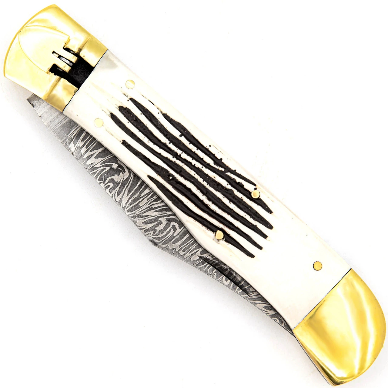 Our County Line Damascus Steel Lever Lock Knife is expertly crafted from only the finest quality materials to ensure you have a functional tool and beautiful collector’s piece that will last you a lifetime. The Damascus clip point blade is composed from 1095/15N20 Alloy Steel that has been tempered around 54 to 55 with approximately 176 true blade layers. This unique pocket knife features a double wall construction with the inner framing made of sturdy steel. Mounted to the steel framing is imitation stag mounts that definitely pass as the real deal. The spacers, pins, bolsters, and free-falling lever lock are all made from 100% genuine brass with a stunning gold shine. Pushing the lever down with your thumb will effortlessly deploy the blade. A gorgeous semicircle design present on the spine of the handle gives the knife a refined appearance. Included with this knife is a hand tooled belt sheath made from genuine bovine leather and stained a deep brown color. Overall Length: 11 Inches, Blade Length: 5 Inches