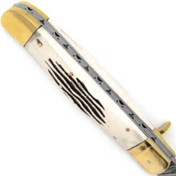 This knife comes well oiled – and it is recommended to polish the knife with a mineral oil from time to time to prevent rusting or corrosion. Brass polish can be used occasionally on the spacers, pins, bolsters, and free-falling lever lock to prevent corrosion and keep a lustrous shine