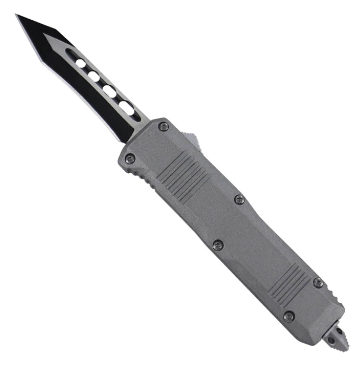 All of the benefits of an automatic Out the Front knife- now in a miniature size! Automatic knives are great because they offer a remarkable weapon at the push of a button. This knife features a reverse tanto style blade with a two-toned finish. The belly of the blade is slightly concave. 4 cutout holes are sported on the blood groove of the blade for added detail. The zinc alloy handle with a silver finish has a mounted pocket clip on the back and a glass breaker on the bottom in case of an emergency situation. This knife is double action, meaning that when you slide the button located on the side of the handle upward, the blade rockets out of the front of the handle. Slide the button down and the blade shoots back into the handle. Also included is a free black nylon sheath so you can take your knife anywhere.