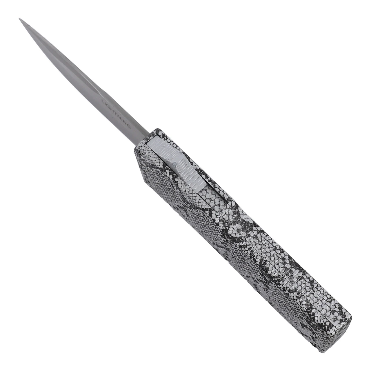 To say that you need an out the front knife in your collection is an understatement. You simply MUST HAVE one! And what better out the front knife to have than a LIGHTNING dual action out the front knife? These knives aren’t called LIGHTNING for nothing, and once you eject and retract the blade with the switch on the side of the handle, you’ll understand why! With a buttery smooth spring system, the blade pops out of the front of the handle almost instantly. Made from stainless steel, this drop point blade is sure to wow with its smooth satin finish and incredible cutting capabilities. As if this knife needed any help looking cool, the zinc alloy handle features a snakeskin finish with a textured feel for the perfect grip. A pocket clip is attached to the handle, but a free black sheath is also included for safe storage and easy carry.