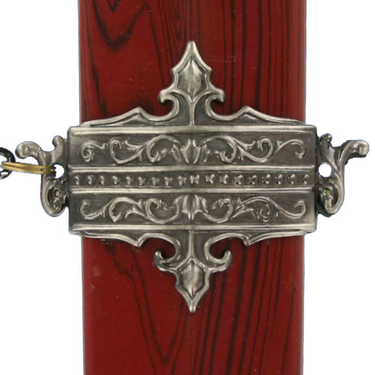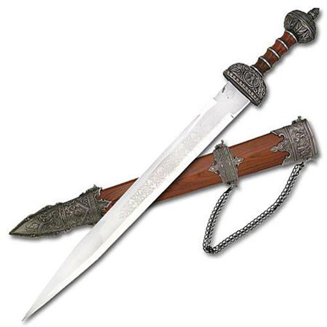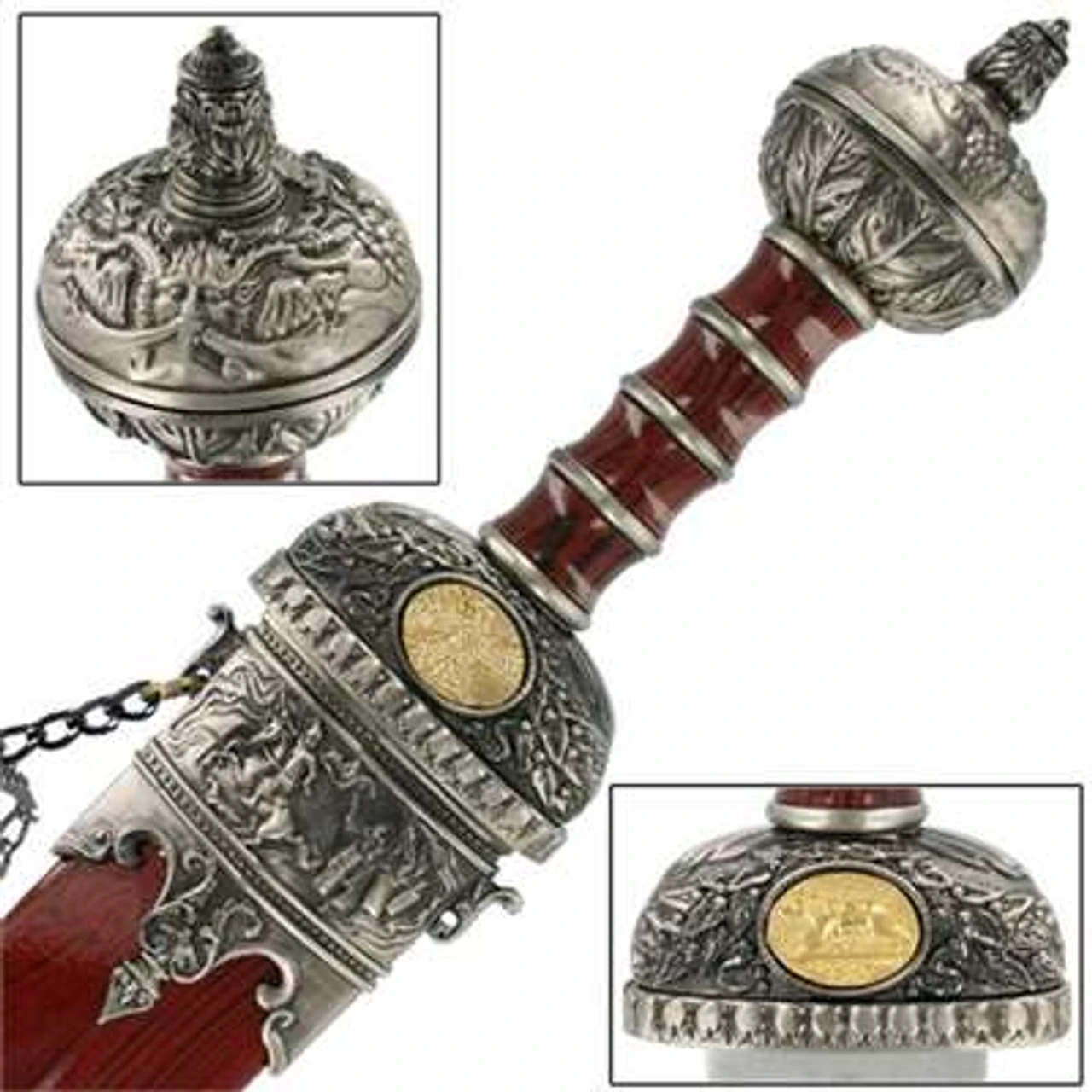 Enjoy the mirror polished shine of the 440 stainless steel blade on this Divine Roman Empire Short Sword. The blade is double edged for accurate display. Markings on the blade show it’s elegant status, even in the presence of it’s aggressive blade shape. The metal guard is engraved with proud Roman patterns. Pressed into the center of the guard is the pewter crest of the Roman empire, the Eagle. On the opposite side of the guard is a pewter crest bearing Romulus and Remus with the She-Wolf. The handle of the Divine Roman sword is wood grain trimmed with metal rings. Every bit of the pommel has received fully detailed engravings. The sheath to this Divine Roman Short Sword is a work of art by itself. Leading the centuries to battle is the Imperial Cavalry. A metal chain drapes from the top fitting to the middle of the sheath. Overall Length: 30.25 Inches. Blade Length: 22.15 Inches. Includes: Full Scabbard, Chain Strap, Sword Stand.