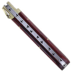 The Ember in Veins Damascus Clip Point Automatic Switchblade Lever Lock Knife is an automatic switchblade knife with a striking red and black wood handle. The blade itself is Damascus steel cut into a clip point shape which exudes elegance. The Ember in Veins Damascus Clip Point Automatic Switchblade Lever Lock Knife is equipped with a lever lock for safety when the knife is not in use. When the lever is in the up position the knife will not deploy and when the lever is in the down position, simply press down on it and the blade will deploy. The Ember in Veins Damascus Clip Point Automatic Switchblade Lever Lock Knife comes with its own genuine leather sheath with a belt loop for safekeeping when the knife is not in use as well as for easy carry. Overall Length: 9.21 Inches. Weight: 272.2 g.
