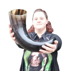 All-natural buffalo horn is hollowed by hand and carved to create this authentic drinking horn. Each horn is individually crafted, between 20 inches and 23 inches long. No two are the same. They can hold about 1100 ml to 1400 ml of water, wine, beer, ale, etc. The exterior is polished to a smooth shine. Coloring of the horn varies according to how it was grown in nature. Mostly it is black and calcium white. Drinking horns were traditionally used in many parts of the world. Sometimes ceremonial, and often as an everyday drinking horn. What is unique about the horn, it cannot be set down on a table until it is empty. Ensure a guest drinks all of their wine with one of these natural drinking horns. Please clean the horn before using. Overall Length: 20 Inches to 23 Inches, Estimated Capacity: 1100 ml to 1400 ml