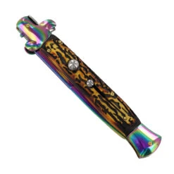 During the 1950s, large numbers of folding switchblade or automatic opening knives with locking blades were imported from Italy to the United States. From there they only rose in popularity. Take this beauty for instance. It incorporates a long, slender blade tapering to a needle-like point, together with a slim-profile handle and vestigial cross-guard. The blade is made from stainless steel with a anodized titanium rainbow finish. The handle is made from durable ABS with a faux stag appearance. All the other elements such as the bolsters, frame, lock, and button are also made from steel, with a titanium finish on the pommel and bolster. Once you release the blade the powerful spring action opens and locks the blade in place. A safety lock is included on the handle for preventing accidental opening. Included is a nylon sheath to safely house your blade. Overall Length: 10 1/2 inches, Length of Blade: 4 1/2 inches, Length of Handle: 6 inches