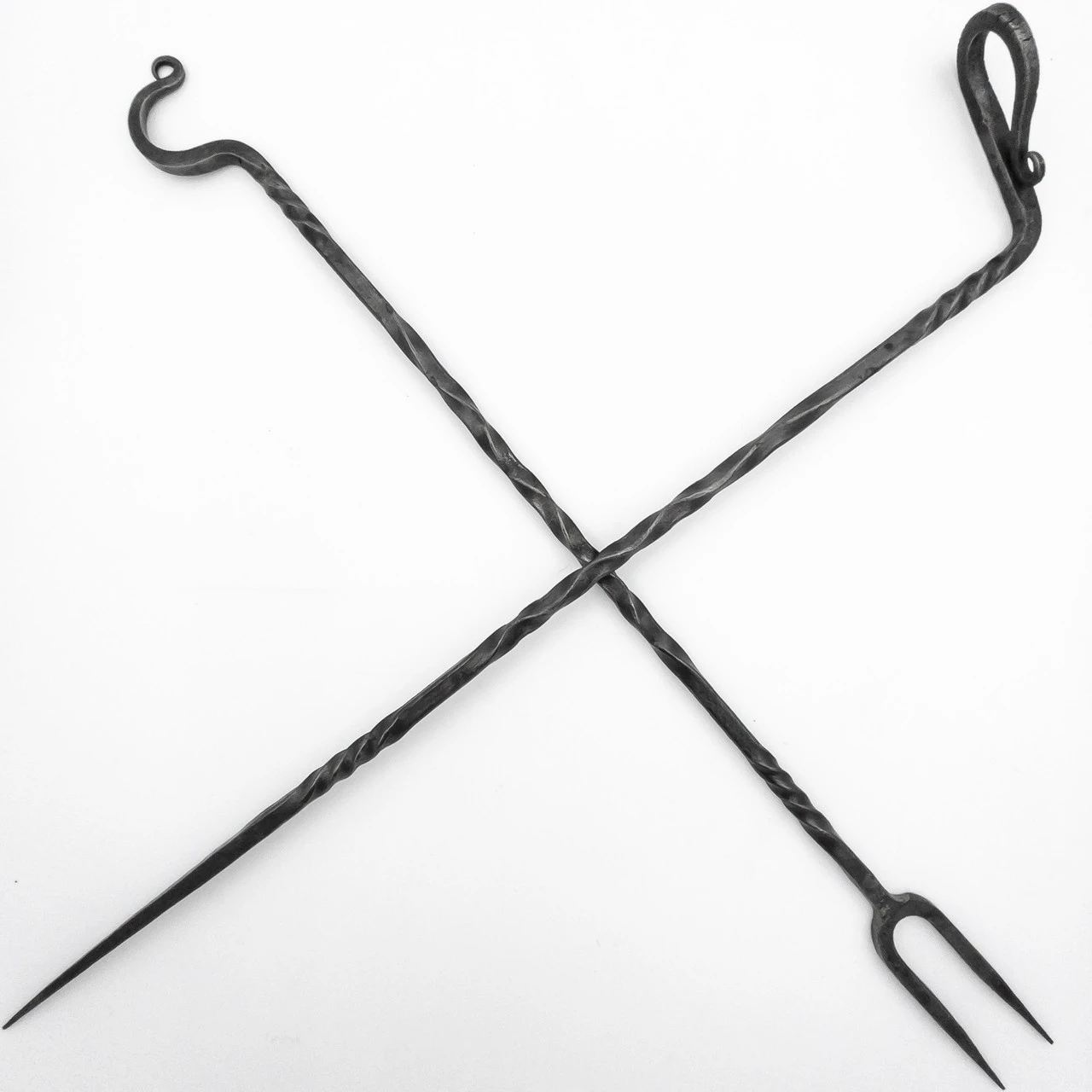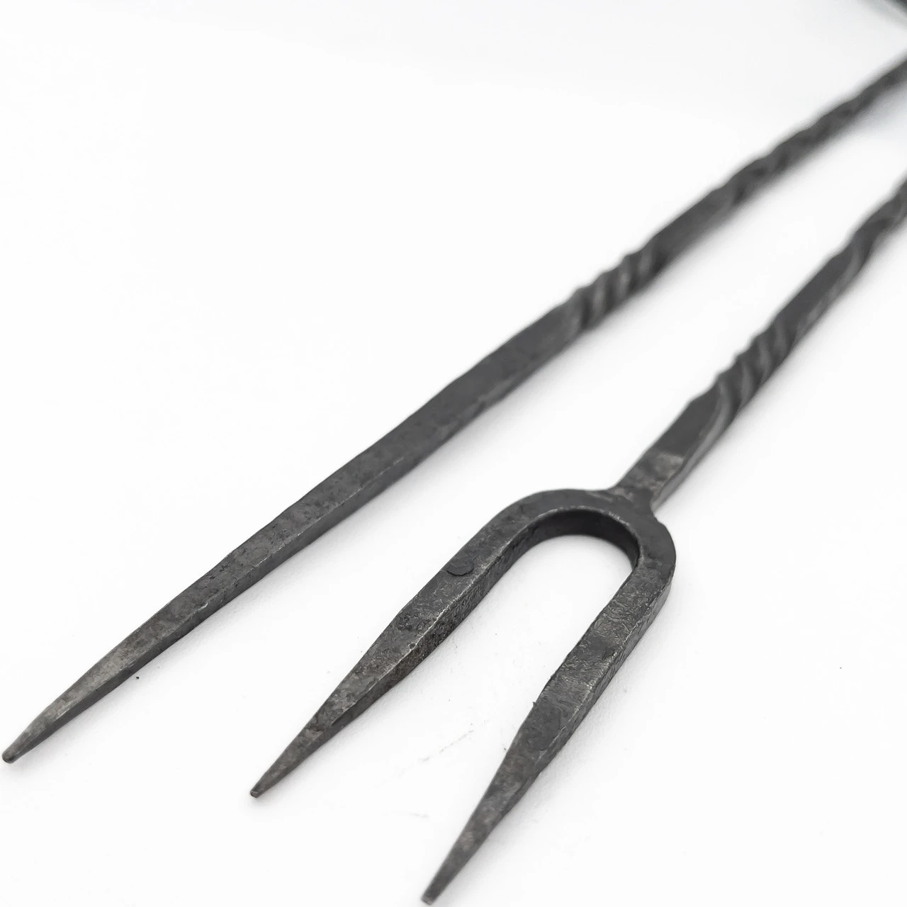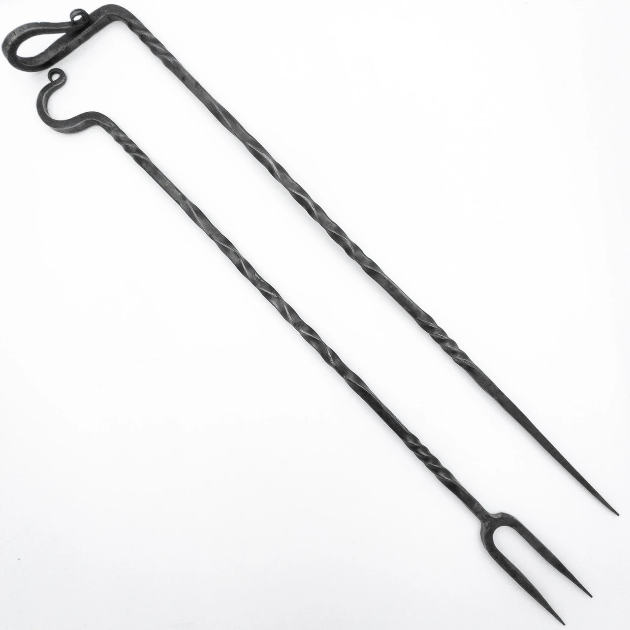 Open fires yield the best meat. Meat that is expertly seasoned with a texture that melts in your mouth. A bit of red still in it and glistening in the firelight. This isn’t the type of meal that can be eaten neatly. This is the type of meal that transforms you into a warrior indulging after a hard-won battle, barely steps off the battlefield and yet perfectly at home among friends. Surrounded by people telling stories and laughing and singing all sharing a meal after fighting for each other. It’s been this way for years. It’s been like this for generations and still each meal is better than the last. Are you hungry, yet? If so, then the Feast of Emperors Medieval Serving Fork and Skewer Set is here to accentuate your next meal with a bit of medieval flavor. The Feast of Emperors Medieval Serving Fork and Skewer Set is a set of two, one serving fork and one skewer. The utensils are made of iron so they are authentic and sturdy. Not only that but they are huge. The fork is 15.75 inches long and the skewer is 15 inches. The utensils feature intricate twists along the handle and the handles end in hooks so they can easily be hung up during meal prep or displayed. The fork has two prongs as was typical of medieval silverware. The Feast of Emperors Medieval Serving Fork and Skewer Set is perfect for reenactment, theme parties, or collectors. Fork Overall Length: 15.75 inches, Skewer Overall Length: 15 inches