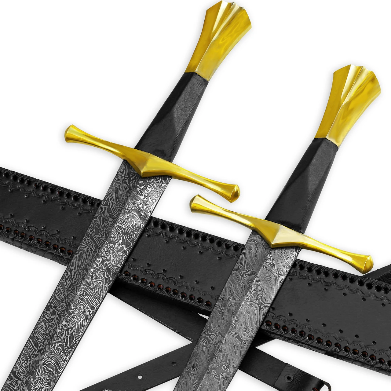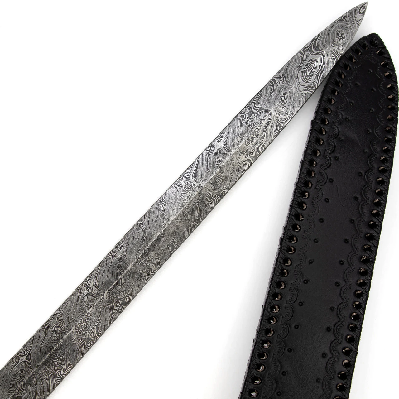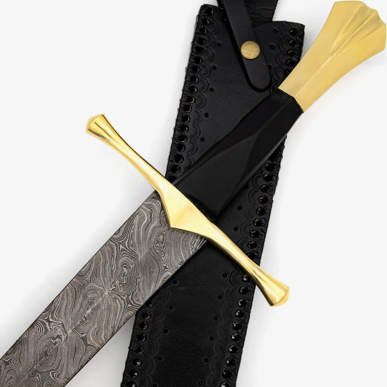 The first light of dawn is golden; washing the inky shadows from the world as it spills over the horizon. Justice is like this- and taken for granted the exact same way. The First Light Medieval Sword is a full size, 38.5-inch Damascus sword with a black leather handle and golden brass guard and pommel. This isn’t just any Damascus though; you have the choice of either firestorm Damascus or twist Damascus for the blade. Firestorm Damascus is characterized by disordered and vivid shapes in the steel while twist Damascus features more circular patterning with distinct centers. Of course, both variations of the First Light Medieval Sword come with a genuine leather sheath. The sheath is black with an imprinted motif along the edges and has both a shoulder strap and belt loop. Overall Length: 38.5 Inches. Weight: 5 lbs.