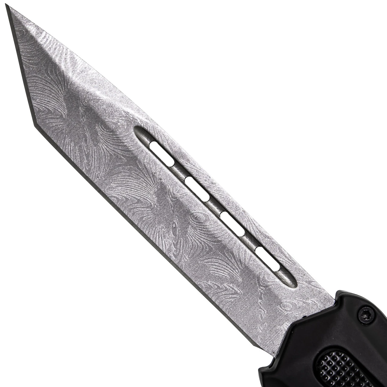 Foreboding Contour Damascus Tanto Automatic OTF Black Handle Knife W/ Textured Center Switch
