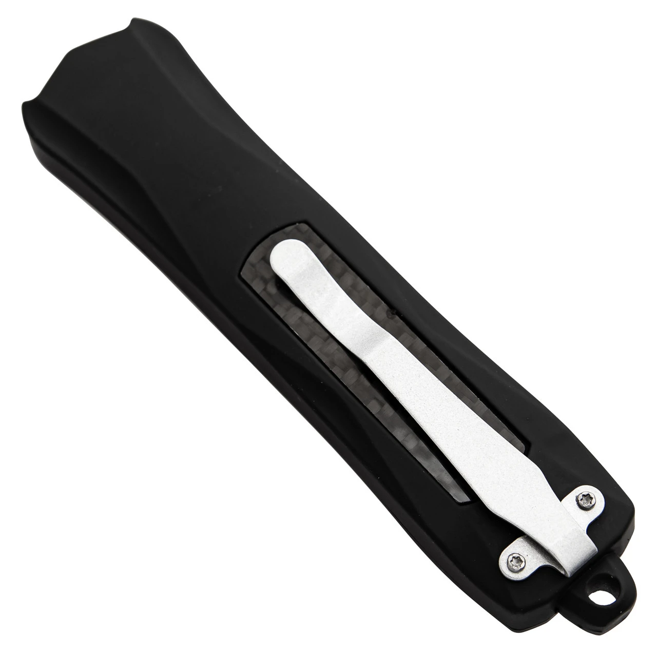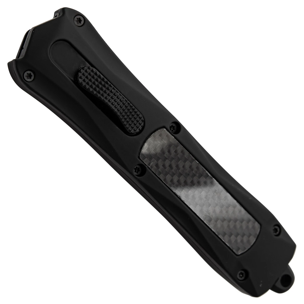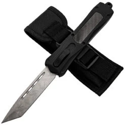 Changing the shape of a knife’s handle can drastically affect its presence. The Foreboding Contour OTF is proof of this. The tip of the handle where the blade comes out features an intense, angular shape that compliments the tanto blade shape perfectly. A black carbon fiber inlay provides the only reflective surface on the matte black zinc aluminum handle and these inlays adorn both sides of the handle. Composed of Damascus Steel, the tanto shaped blade features a unique design that differs with each knife. There are four cutouts along the blade’s fuller for weight reduction and dispersion. The textured switch to deploy the blade is centered on the handle for ease of use. The Foreboding Contour OTF comes complete with a belt clip as well as a nylon sheath equipped with a belt loop. Overall Length: 9.13 Inches. Weight: 0.75 lbs.