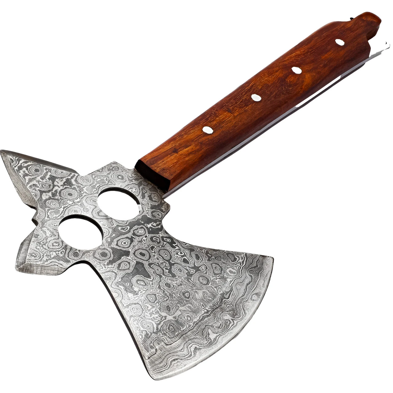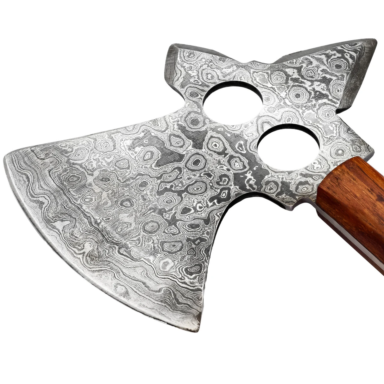 The glint of light that catches off metal as it flies is addicting. When the piece hits the perfect arc and buries itself into the target you know that your training has paid off. The Glinting Light Throwing Axe is a 0.85-pound hatchet with a blade hand forged from Damascus steel and force welded securely onto a high carbon steel handle. Walnut wood scales are pinned to the steel in 4 different places with mosaic pins. Two finger holes are cut into the blade for ease of throwing and two smaller lanyard holes are cut into the base of the handle for easy carry. The blade features three sharp edges for easy catching on a target. Included with the Glinting Light Damascus Axe is a black genuine leather sheath for easy carry and safe storage. Overall Length: 12 Inches. Weight: 0.85 lbs.