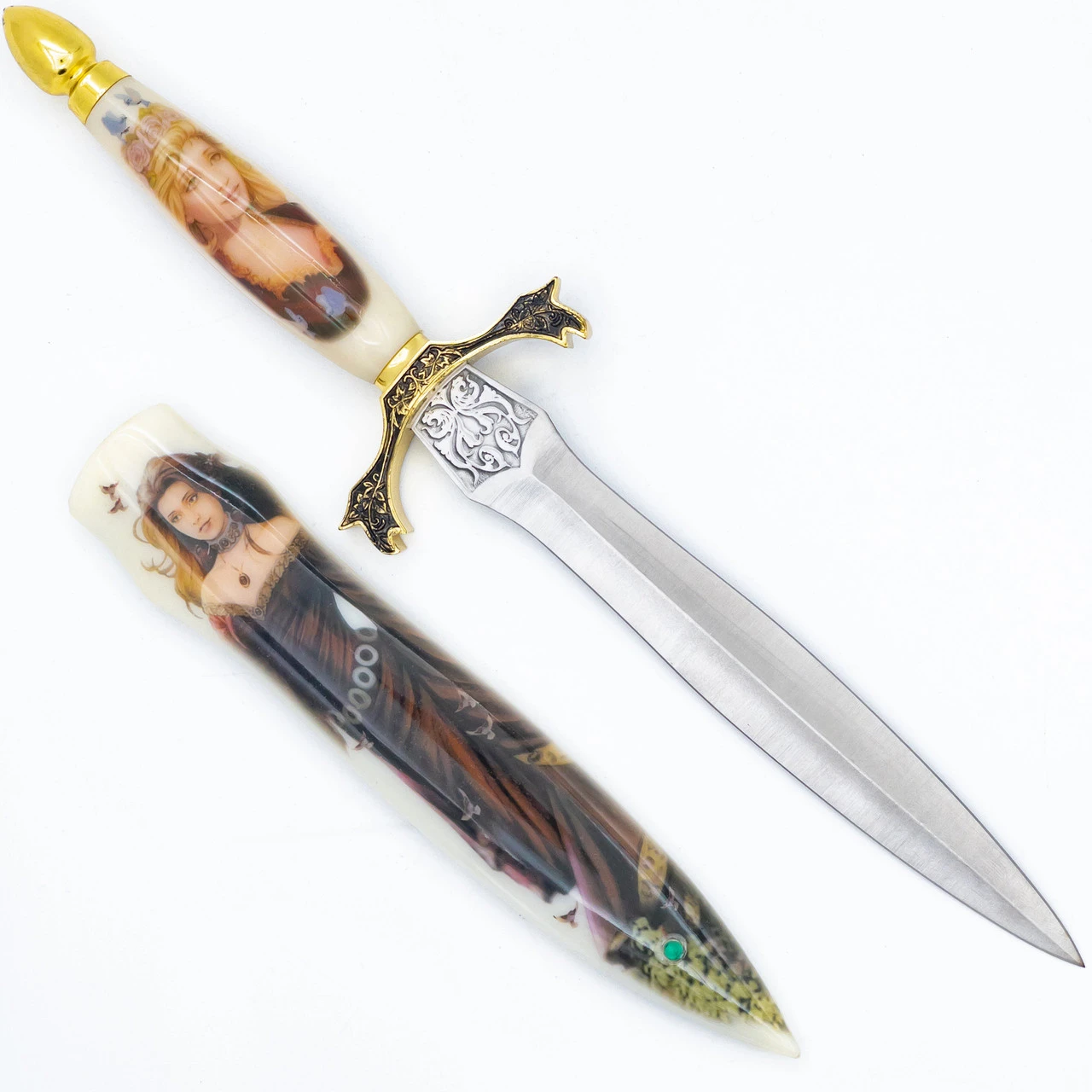 The Goddess Ethereal Display Dagger Fantasy Knife is a display dagger with the image of goddesses printed over the ABS sheath and handle. The handle features a blonde goddess with flowers in her hair and the sheath features a brunette goddess in a gorgeous brown gown walking among birds. These images appear on both sides so the Display Fantasy Dagger can be displayed on either side and still look delicate and graceful. The blade inside is composed of stainless steel with a pattern on the blade towards the handle that is reminiscent of a mermaid tail. The guard is zinc alloy colored an endlessly deep, rich gold with vine patterning along it on both sides. The Goddess Ethereal Dagger is every collector’s dream with its intricate artwork and stunning colors. Overall Length: 12 Inches. Weight: 0.5 lbs.