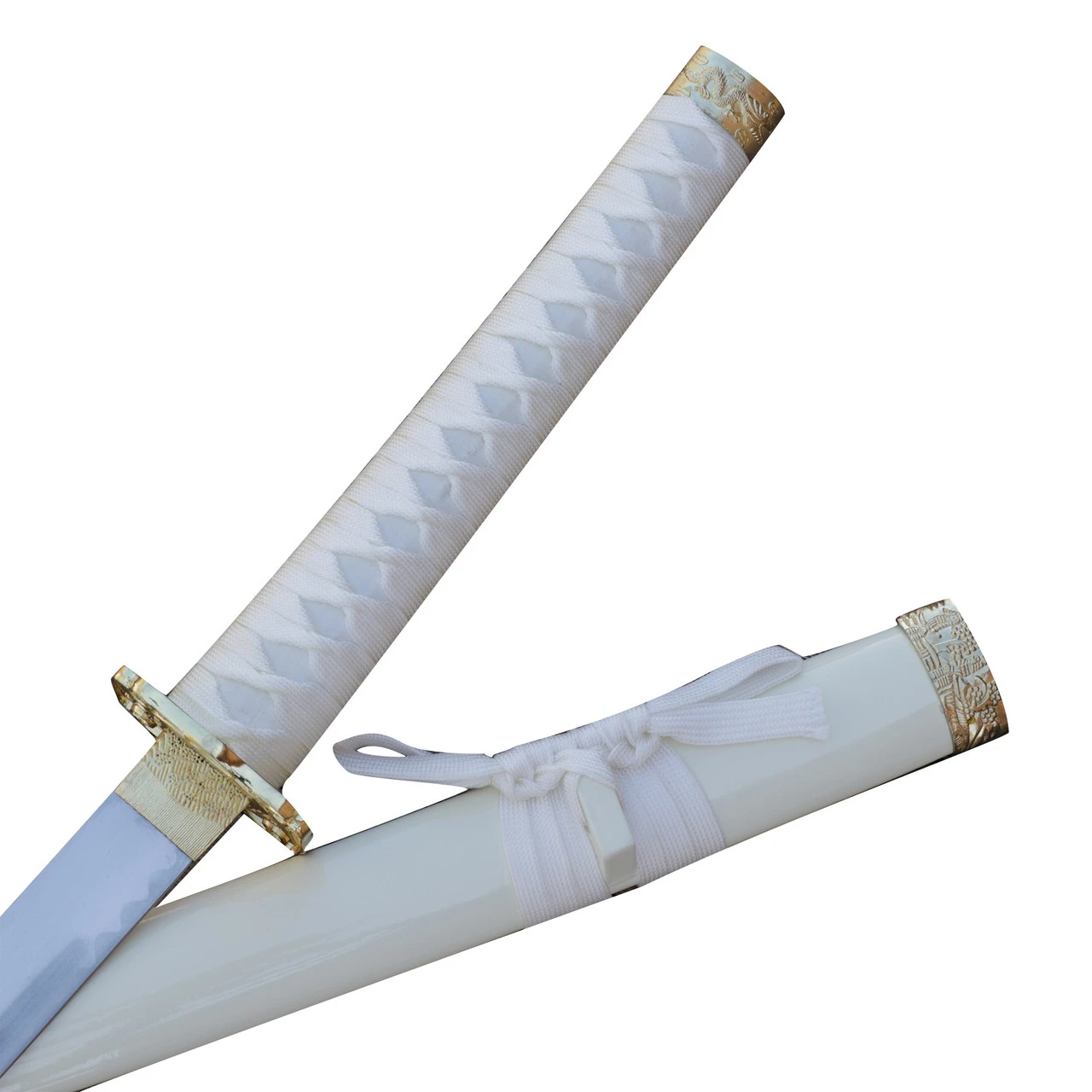 This exquisite decorative sword is the perfect addition to your samurai collection. The carbon steel blade comes with a factory edge and etched hamon in a gunome design. The guard is shaped in traditional rectangular style with oriental dragons featured throughout, made from zinc with a shiny gold finish. The long handle is wrapped in white rayon with a traditional Tsumami-Maki style and topped with a gold toned pommel featuring a similar serpent dragon design. The saya is made from sturdy wood and features an eggshell finish and gold-toned kojiri and koiguchi that depicts two samurai ready to engage in battle, as well as other breathtaking oriental designs. The simple yet elegant style of this katana makes it befitting for royalty. This sword is one heck of a beauty for sure, and it can be all yours. Overall Length: 37 inches, Blade Length: 26 inches