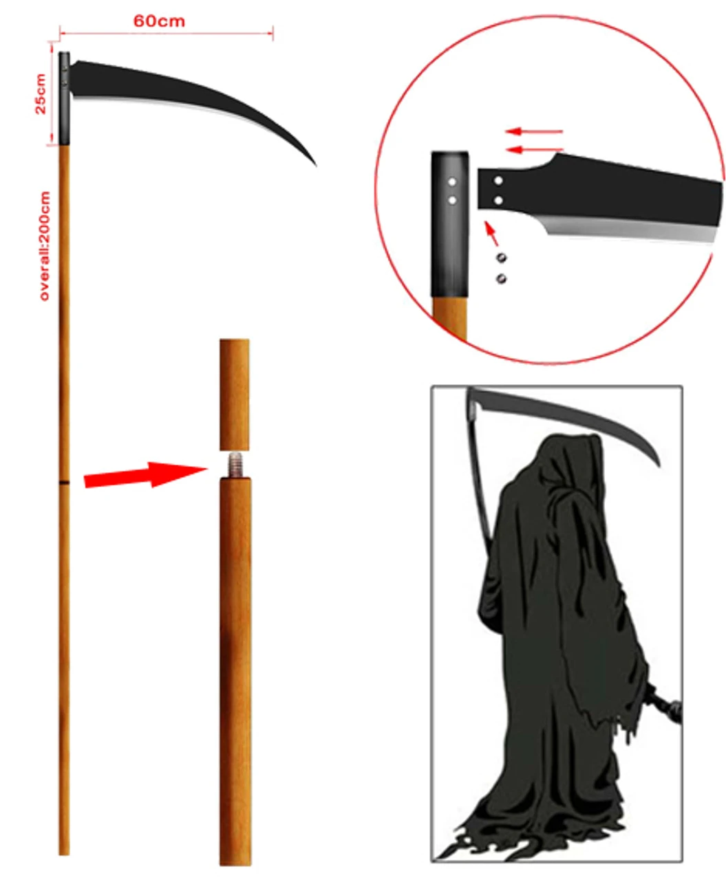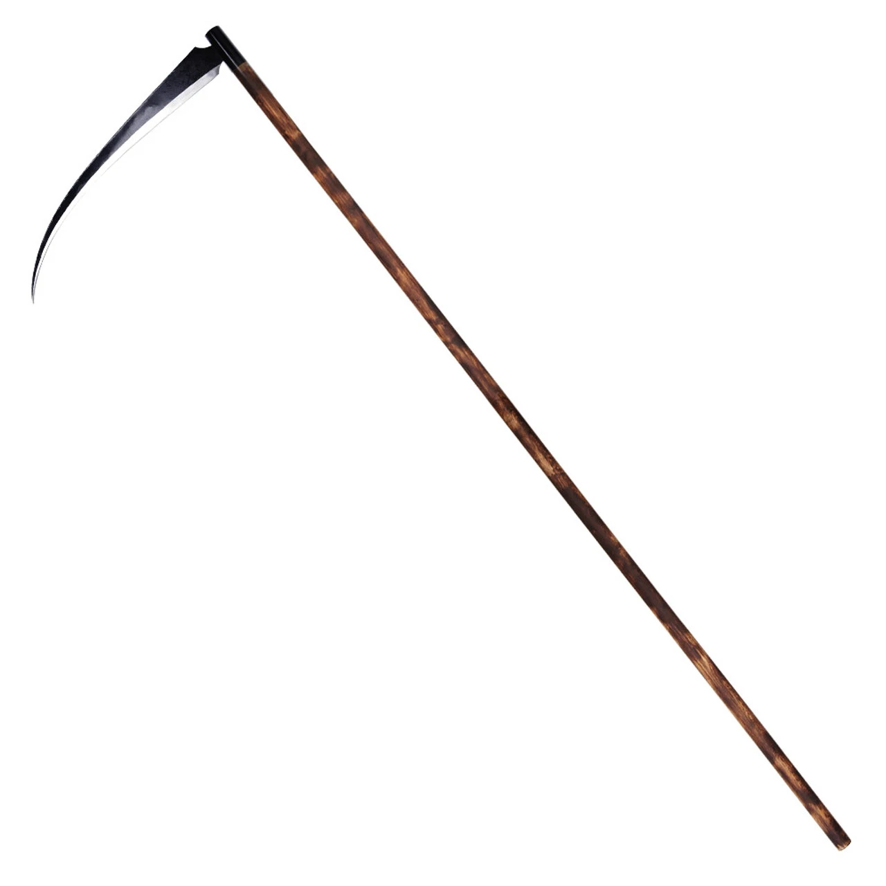 The reaper scythe is the most ubiquitous symbol known to mankind. Faithfully carried by the Grim Reaper, Death Personified, it represents the cold and unstoppable grip of fate. It has been widely depicted in books, movies, games, and even religious scripture and mythology. This is a life sized replica of the worlds most recognizable weapon, the reaper scythe. The two piece hardwood handle is a startling 80 inches long with a 23.5 inch long coated stainless steel blade. The blade tip tapers into a sharp point. Whether for display or costume, this scythe is guaranteed to garner some stark reactions… almost as if they laid eyes upon death himself.