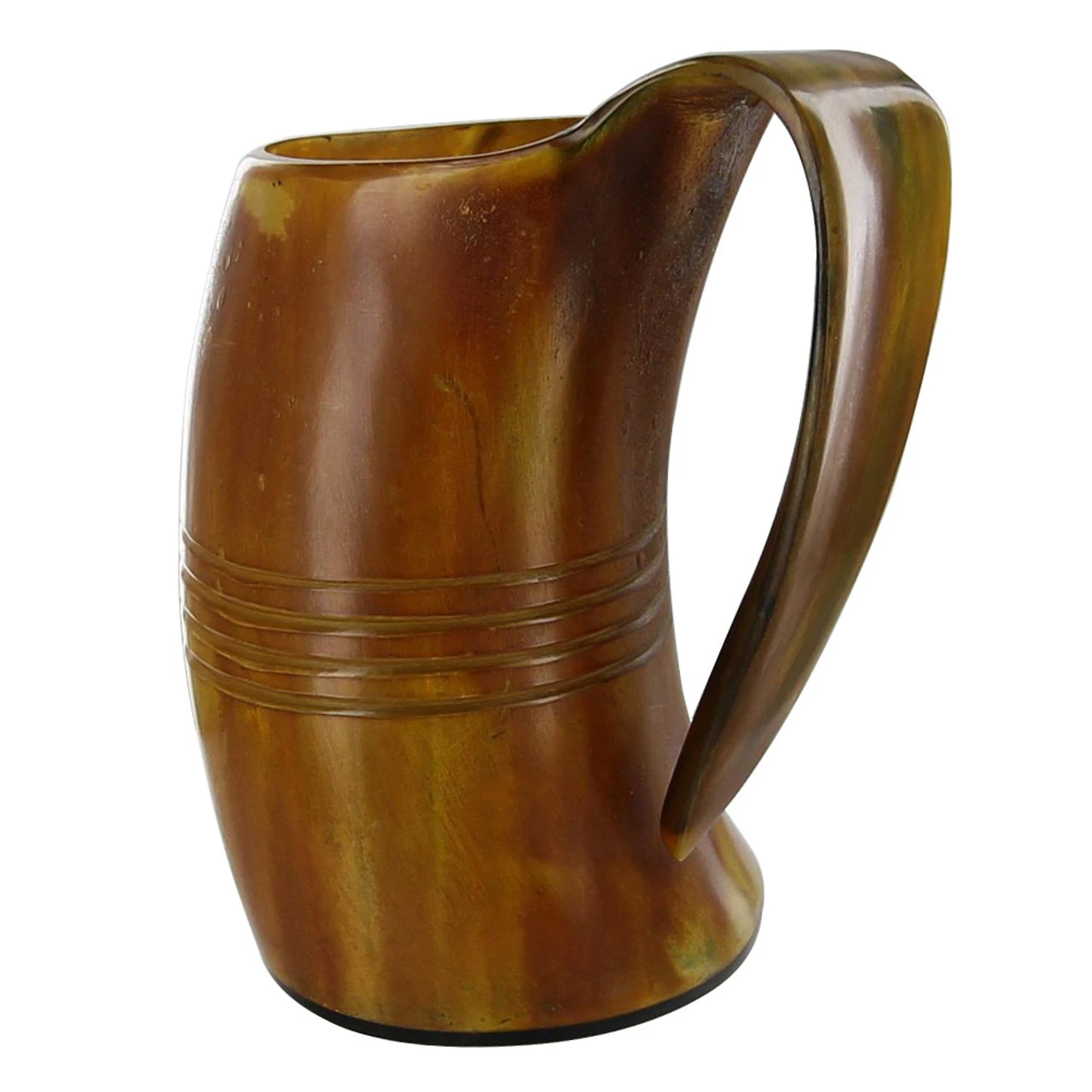 This tankard is made from all natural horn and stained a butterscotch color. Four narrow connecting bands are carved around the center. The flat bottom is also constructed from horn as well as the handle. Cup Height: 5-7 Inches. Estimated Capacity: 22-26 oz.
