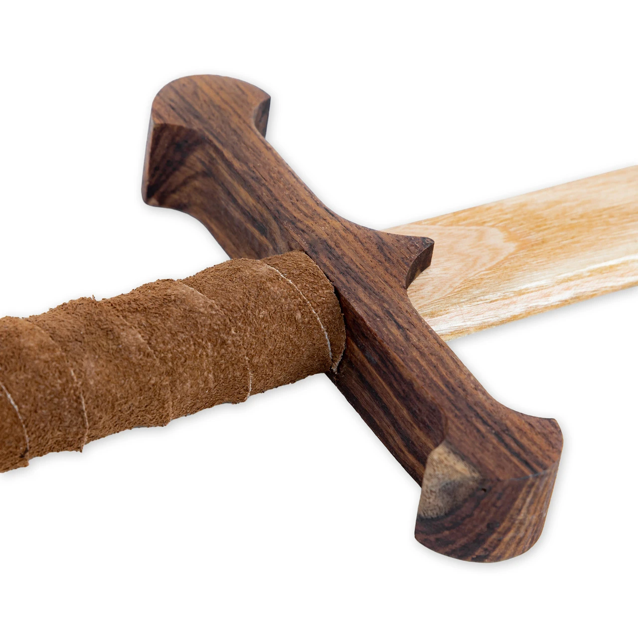 The sounds of feet on the ground as thunder and the clashing of swords as lightning; this is a storm of the ages. The Hooved Combatant Wooden Sword is a dual tone sheesham wood sword that is perfect for any training, play, or reenactment needs. Composed of wood, this piece is not only a perfectly safe alternative to a real sword, it is much lighter than a metal sword so anyone can use it comfortably. The blade of the sword is a light tan while the hilt is stained a darker brown. Brown leather is wrapped around the handle for comfortable grip and to elevate the design for use in professional reenactments. The Hooved Combatant Medieval Inspired Wooden Sword is perfect for any reenactment, play, or training needs. Overall Length: 42 Inches. Weight: 1.15 lbs.