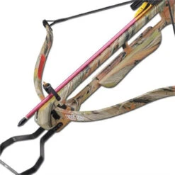It fires at a speed of 210 feet per second, piercing large or thick targets with ease. The camo aluminum body and steel hardware allow this crossbow to utilize the power needed for heavy duty tasks like piercing armor. The stock is wooden fiberglass compound for a superior hold and stability while firing and it comes pre-strung so you don’t have to kill yourself trying to string the crossbow. A rear sight can be attached to the slide for fully adjustable fitments. The front sight is adjustable to ensure you receive 100% accuracy from this crossbow. Cock it back easily with the foot stirrup and 16 inch aluminum bolt arrows can be loaded quickly. A tool kit and arrow starter set will be included with the crossbow. Overall Length: 35 Inches