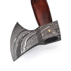 Looking for an axe that can withstand the test of time? Well look no further. This functional handmade axe is constructed from excellent quality materials and is made to be used. The head of the axe is made from folding 1095/15N20 steels over and over approximately 350-360 times to create the gorgeous rippling affect you see here. The large crescent-shaped blade edge provides a larger cutting edge, and the slight slope of the blade allows downward strikes. The back of the axe head is flattened to serve as a hammer tool. A pure brass mosaic pin placed in the center of the eye creates a sturdier hold as well as a special touch. The handle is made from sheesham wood that had been smoothed, contoured, and covered with a sleek protective coating. A lanyard hole is provided to attach rope or cord. Included with this beauty is hand tooled genuine leather sheath that has been stained a rich dark brown and features three snap closures and a belt loop for easy secure carry. Overall Length: 16.5 inches, Blade Length: 4 inches