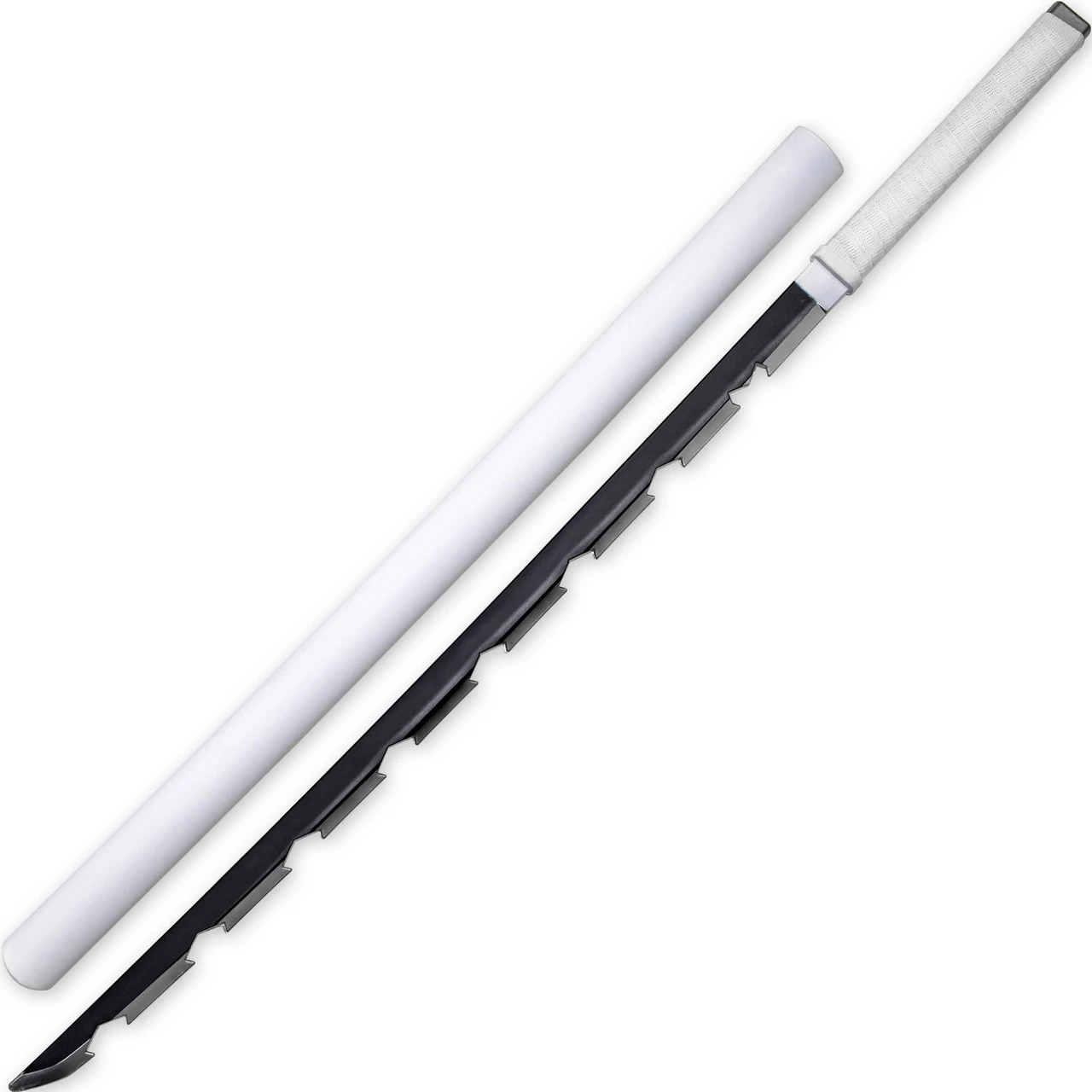 This full-size replica may be made of foam, but it is certainly no children’s toy. This modified Nichirin sword is composed of polyurethane foam and features a 10 mm fiberglass core. Polyurethane foam is both durable and flexible, and the added fiberglass core creates a strong sword that can be used for cosplay as well as kicking bad guy butt in mock battle. The base of the blade is a matte black and has a jagged edge with a silver Hamon. The handle is molded to resemble a cloth wrapping in white, and is topped by a painted silver pommel. Included with your purchase is solid matte white hard plastic scabbard to house your blades when not in use, though this will not be needed for the character since he does not use them. This lightweight prop is the perfect accessory to complete your cosplay and carry around your next convention. Overall Length: 39.5 inches, Blade Length: 29.5 inches