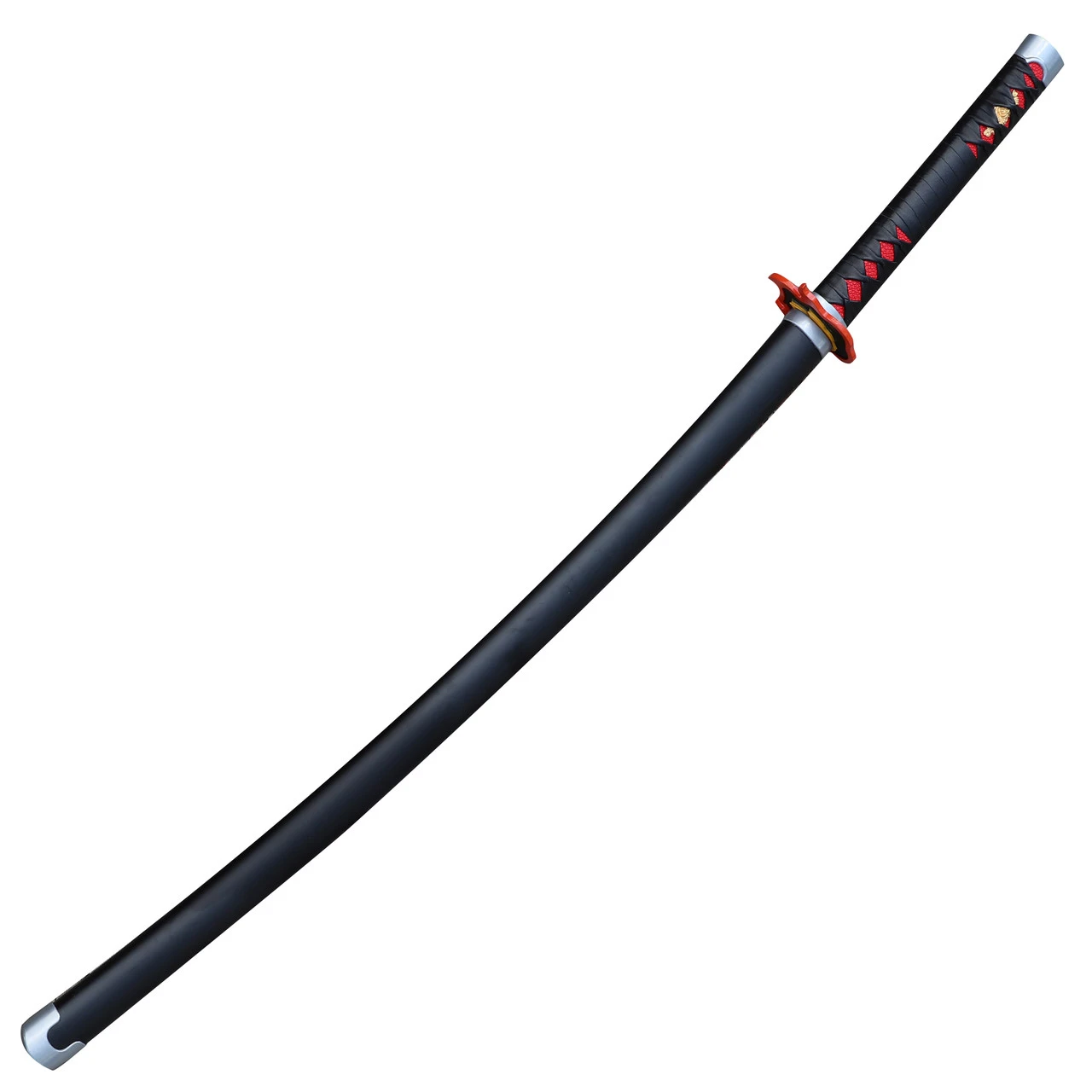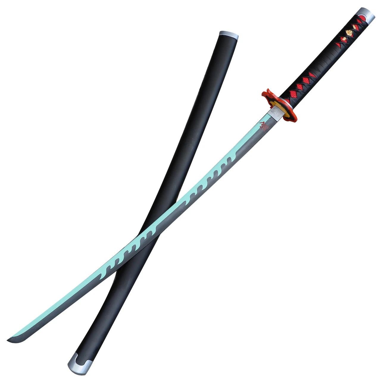 Being a demon slayer is a dangerous and unrelenting job. The kind of training and dedication required to become part of the Demon Slayer Corps could not be achieved without the assistance of a reliable Nichirin, which is the sword or weapon that is specially made for a demon slayer to kill demons. In the anime, the sword is forged from scarlet crimson iron and scarlet crimson ore, which are collected from the mountains. Though we may not be able to obtain these exact materials, we have nonetheless created a fierce katana for your anime collection. This replica katana is made to look just like the sword owned by Tanjiro Kamado, who unearths the 300-year-old blade from a battle doll later on in the series. The blade is constructed of high carbon steel with a factory edge. Etched along each side of the blade is a blue wave-like pattern which symbolizes the character’s ability. A red faux ray skin handle is wrapped meticulously with black faux leather in a traditional Japanese Style. The steel hand guard is made into a flame design with an orange outer edge and yellow core. Included with this beautiful collectible katana sword is a hard matte black scabbard to house your blade when not defeating demons. Overall Length: 38.25 inches, Blade Length: 27 inches