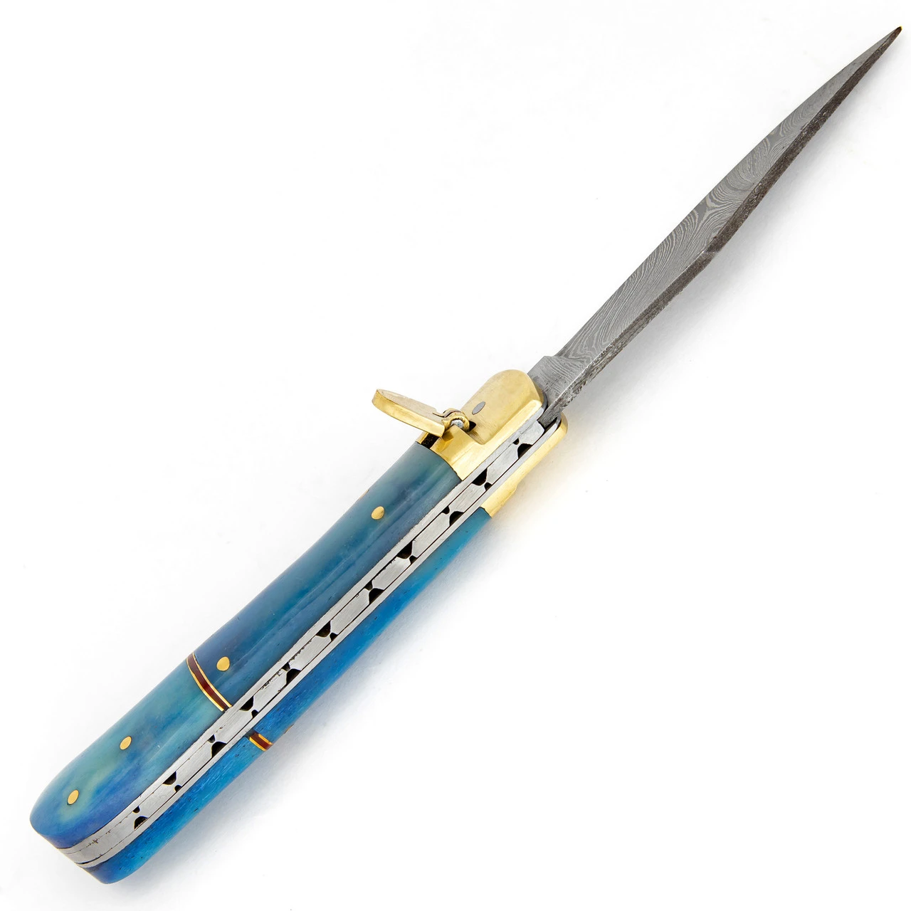 This lovely knife is made from Damascus steel with a clip point blade. The Damascus is created from 1095/15N20 alloy steel with a unique pattern. Damascus is world renowned for its patterns and durability. The handle mounts are made from camel bone and stained a vibrant blue. The handles have been polished and are held together with brass pins. Brass spacers separate each bone segment. The inner frame is solid brass giving this blade a double walled construction. The lever and bolster are brass as well. Push the lever down and deploy the blade with ease. True to the original design the lever moves freely up and down with no stiffness. There are several decorative elements to this knife. There are the bone mounts stained blue, the patterned blade, and the file work on the spine. The Ventura Blue is a great EDC knife. It fits great in the pocket and has a solid construction. Overall Length: 9 Inches. Weight: 0.5 lbs.