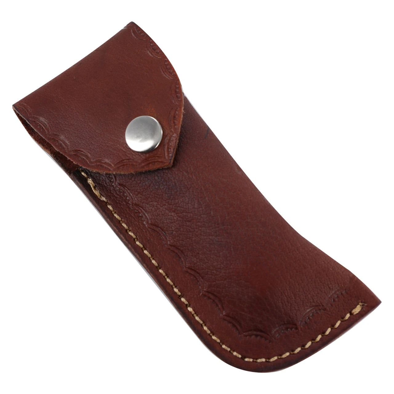 The fire burns a vivid orange and reaches the depths of the sky over the dunes yet somehow a chill lingers behind. The Marked by Fire Lever Lock Knife is an automatic lever lock knife with a stunning Damascus steel, clip point blade and charred camel bone grips. The bolster, lever lock, and hardware are 100% pure brass while the inner frame is carbon steel. The spine of the handle features a lovely hand filed semicircle pattern. The Marked by Fire comes with a genuine leather sheath equipped with a belt loop for easy carry and safe storage. Overall Length: 7.5 Inches. Weight: 0.55 lbs.