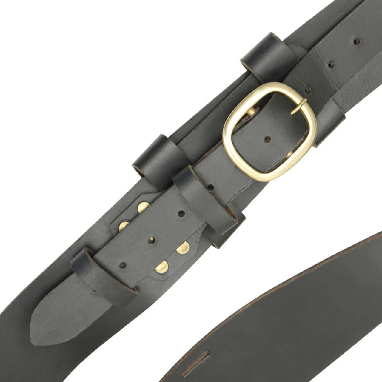 This is the Medieval Baldric Long Sword Hanger made from genuine thick cow hide leather. It is decorated with brass rivets and buckles. The scabbard belt area is well stitched and can be adjusted with to your likeness. A separate piece of leather thong hangs down and attaches onto your belt. This baldric hanger is great to offer your customer with any Medieval Long Swords and claymores. Overall Length: 44 Inches, Strap Adjustable: 29 inches to 44 inches.