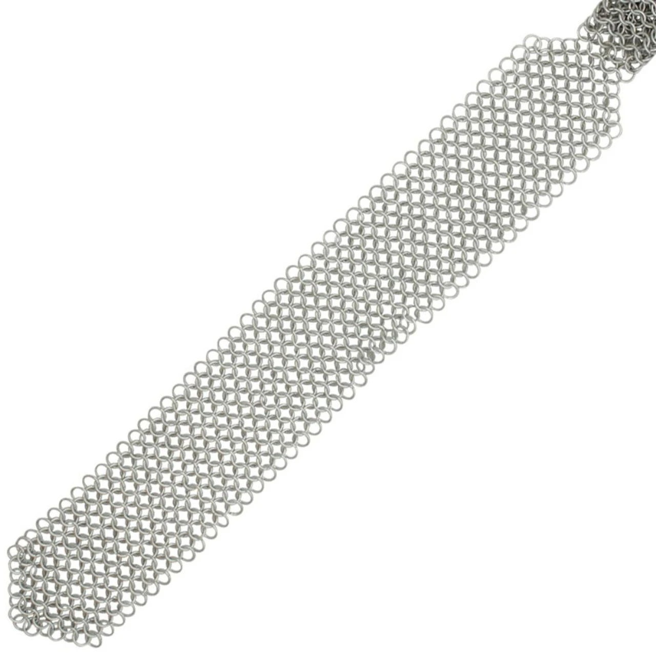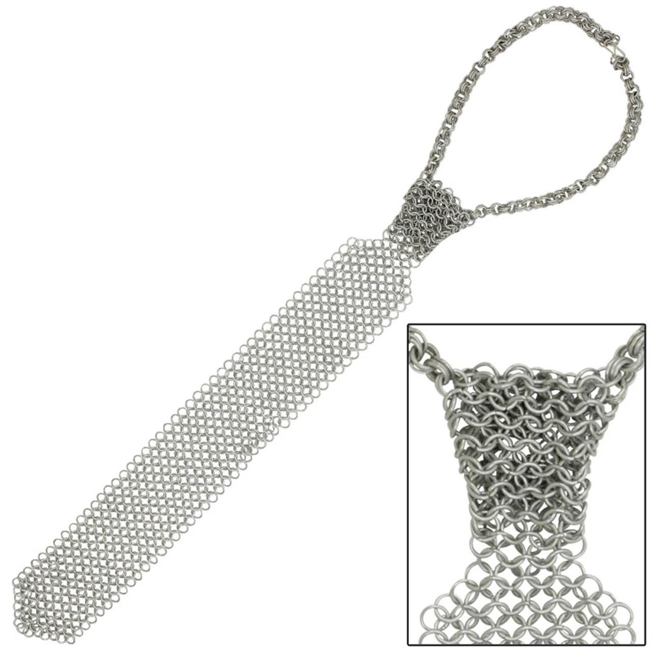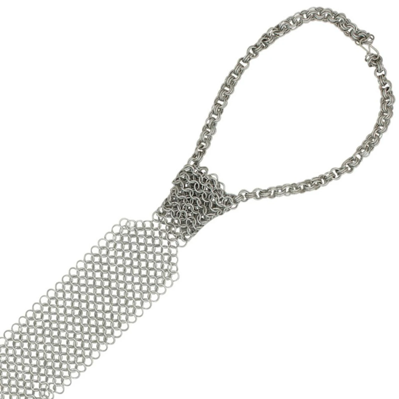 The original power tie. Get in touch with your inner warrior. Whether you are a Knight at heart or a hard bitten mercenary in the board room you will love the attention you get with this tie. While not found in the middle ages it is made the same way mail shirts were crafted. Made of steel chain links with a Windsor style knot that never needs tying since the tie attaches with a clasp behind the neck. Length: 22 Inches Neck Circumference: 18.75 Inches (approximate) Weight: 8 Oz Mail Style: Butted.