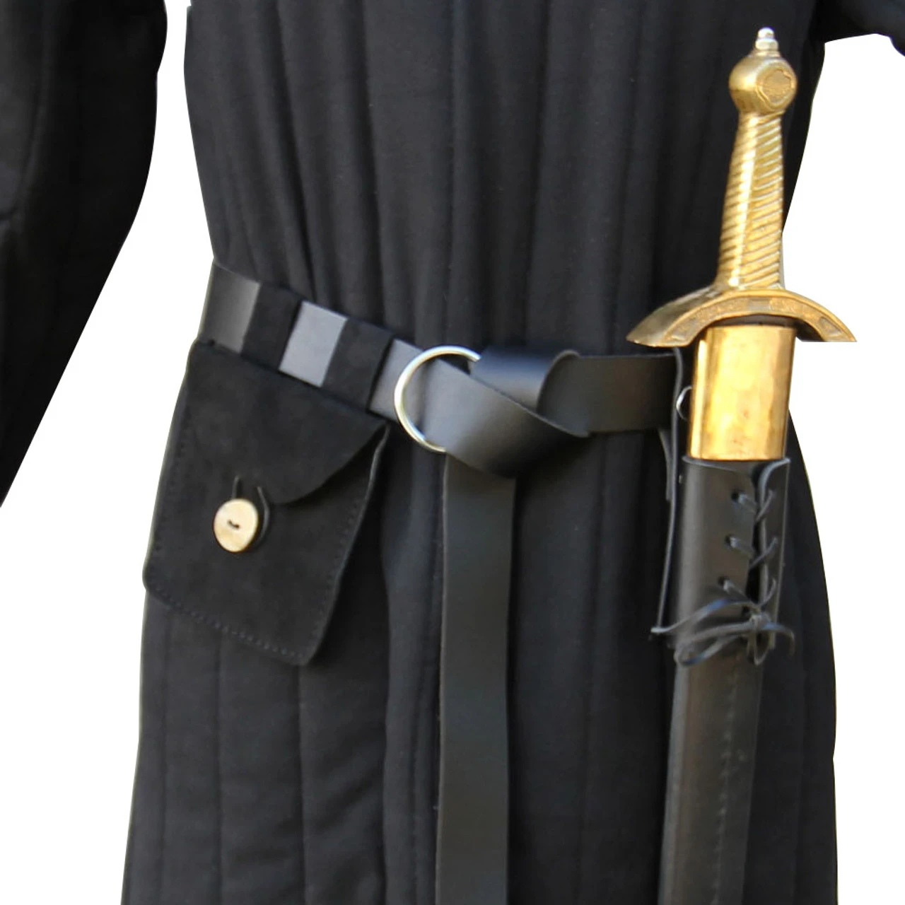 First, you have a handmade leather belt with a steel ring.On one side you have a frog for your sword and the other a pouch for flint and what have you. The way the frog and pouch hand this set is also for left handed people too. The frog comes with a leather lace for adjusting to fit your sword. Completely laced to it has an opening of 1.75 Inch and expand up to 2.50 Inches. The pouch comes in a black hand sewn suede with a horn button enclosure.Overall Length: 72 Inches.