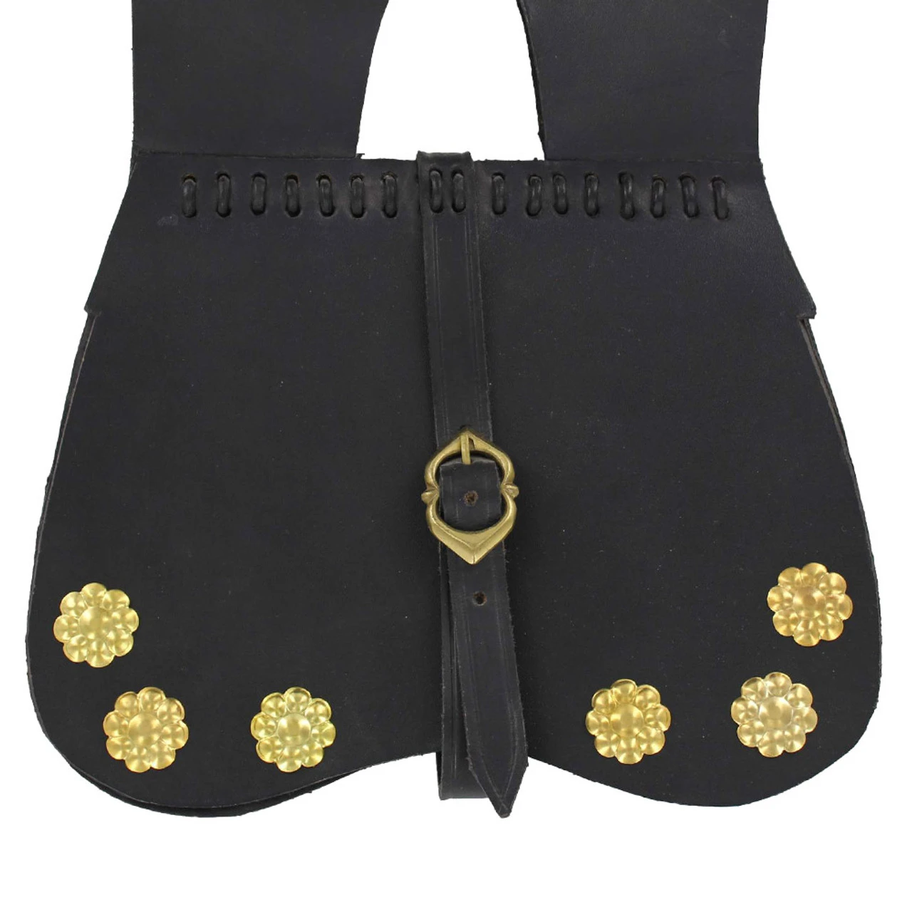 Made from black leather hide this intricate kidney shaped Medieval back will make you stand out from the rest of your medieval friends. It offers a brass buckle strap with two belt loop and beautiful designed stitching. Dimensions: 10.5×9.5 inches