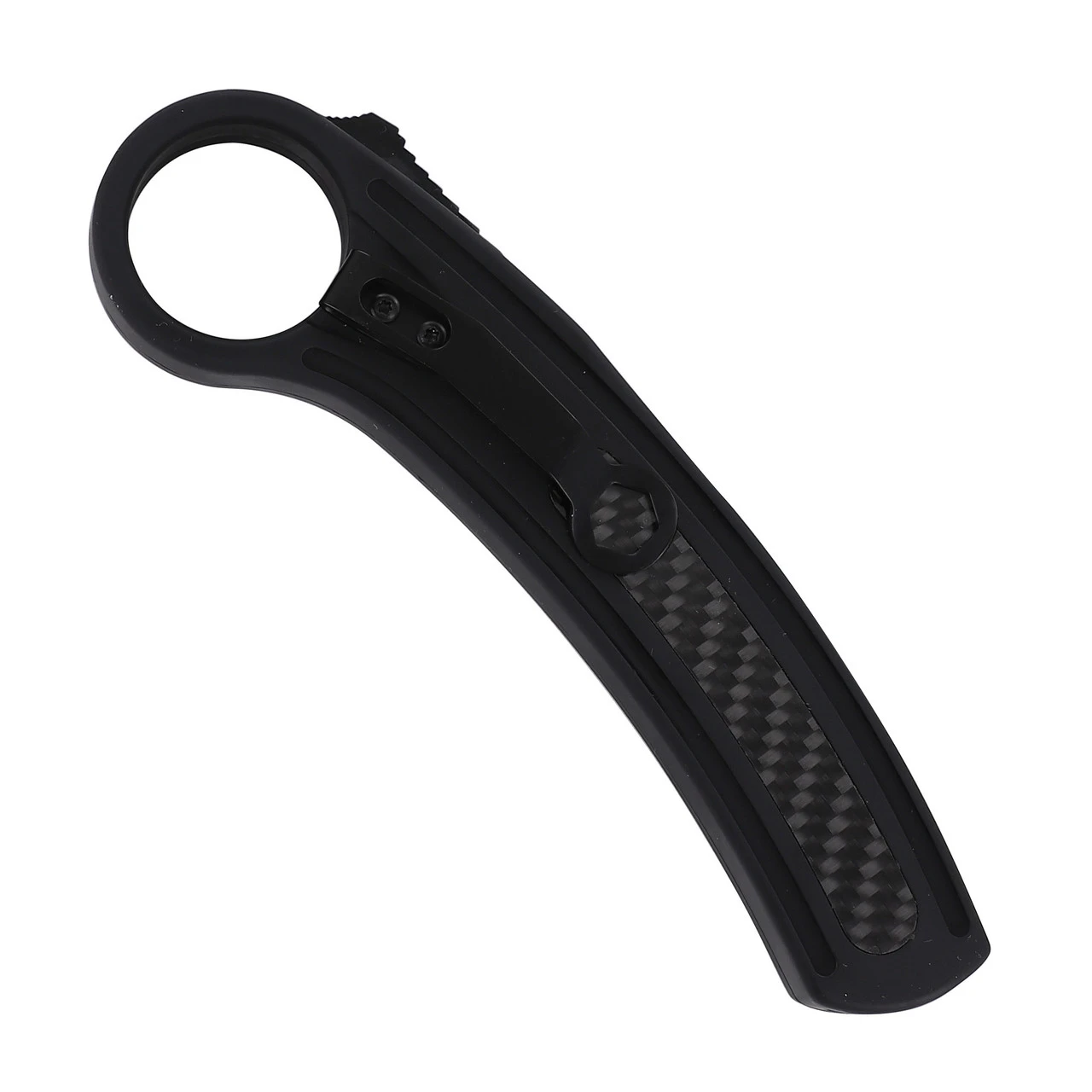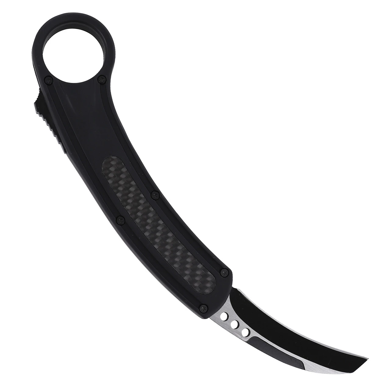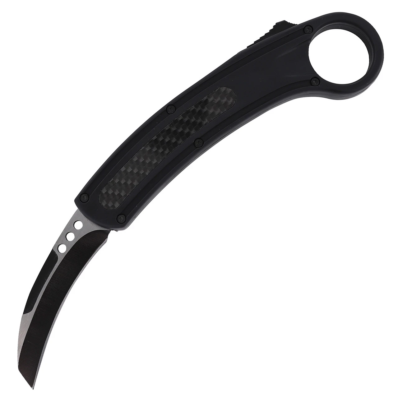 The popularity of automatic knives has risen significantly over the last few years, especially OTFs. This knife in particular looks as though it came straight from an action movie! The stainless-steel blade deploys out the front as usual with these types of automatic knives, but at a curve following the handle. This curved blade features a black and silver finish and sharp cutting edge. The matte black handle is made from durable zinc aluminum and features a carbon fiber inlay on either side adds to the appeal, as if it needed any additional help. A sturdy pocket clip is located on the back of the handle, and the switch to deploy and retract the blade is located on the side near the end of the handle. At the end of the handle is the karambits signature large finger hole which makes it difficult to disarm and allows the knife to be maneuvered in the fingers without losing one’s grip. This nifty knife comes complete with a black nylon sheath with a belt loop and quick release. Overall Length: 8.125 inches, Blade Length: 2.375 inches.