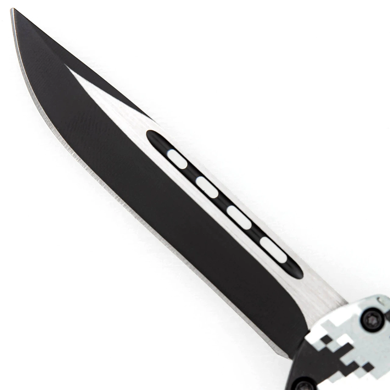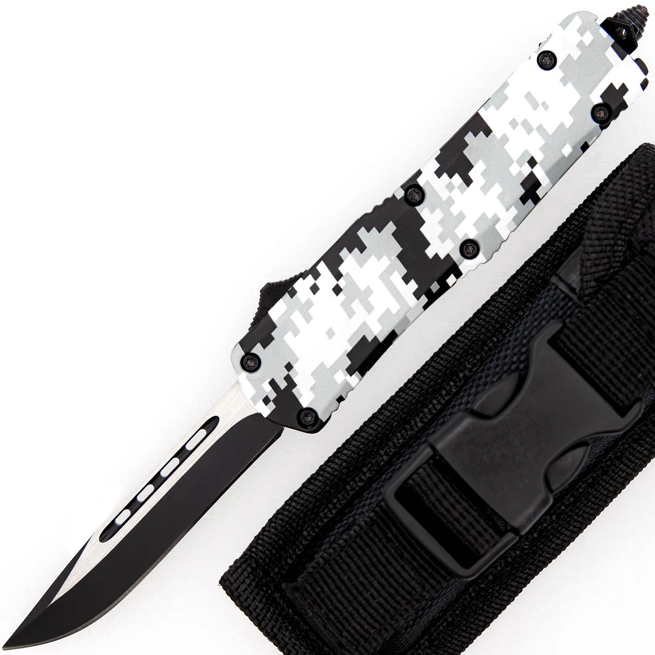 This automatic out the front knife is great because it is dual-action, meaning you can eject and retract your blade with only the push of a button. The stainless-steel blade is made into a drop point style and comes in a two-toned finish. The handle casing is made from a durable zinc aluminum alloy and comes with a digital winter camo design. There is slight ridging along the sides of the handle for better grip, especially in wet conditions. This dual-action automatic knife also comes equipped with a sleek black pocket clip and glass breaker in case of emergencies. Included with your knife is a nylon sheath with snap closure and belt loop so you can conveniently carry it anywhere. Overall Length: 7.3 Inches, Blade Length: 2.8 Inches