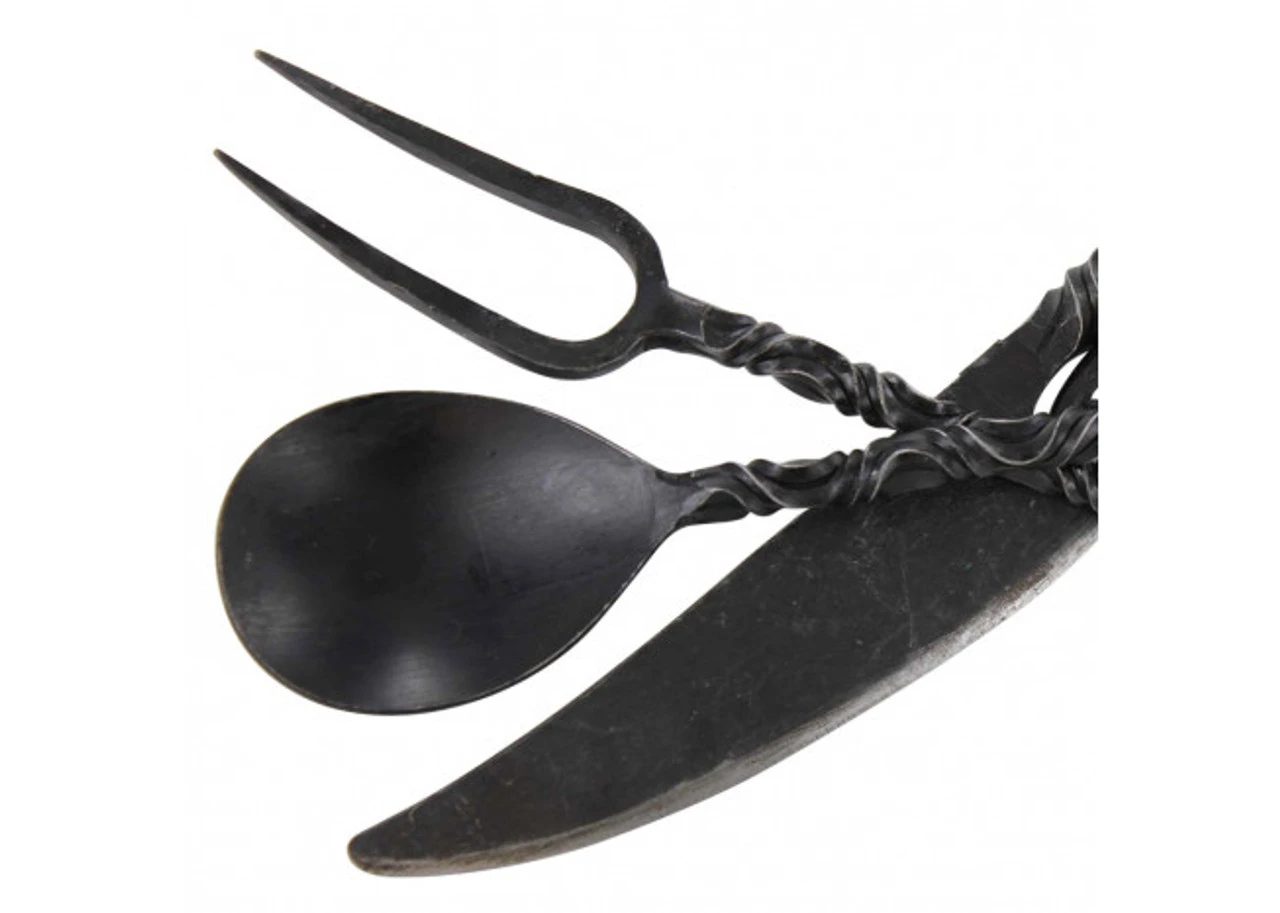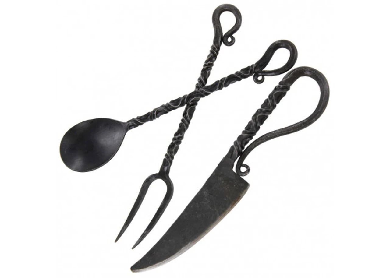 Our feasting set does everything to a person’s confidence but disappoint. Now you can feast like nobles and kings with our new elegant feasting set. The solid iron construction ensures the durability of this set while maintaining strong stability. Our knife comes with a dull blade and firm grasping handle with a sophisticated spiral design for alternate grips. The fork is constructed with the same handle design as our knife but has two tines with the intention of picking up large food items like slices of ham and other large meat. Finally, the solidly built spoon allows you to hold your choice of stews, soups, or porridges. Each end of these utensils has been looped for easy hanging. Medieval feasting will never be the same again.