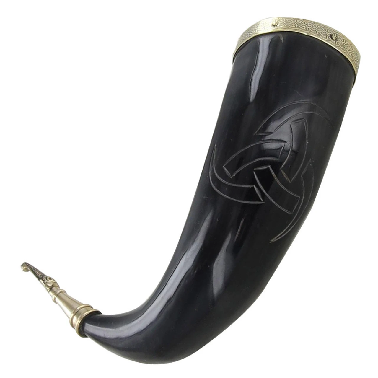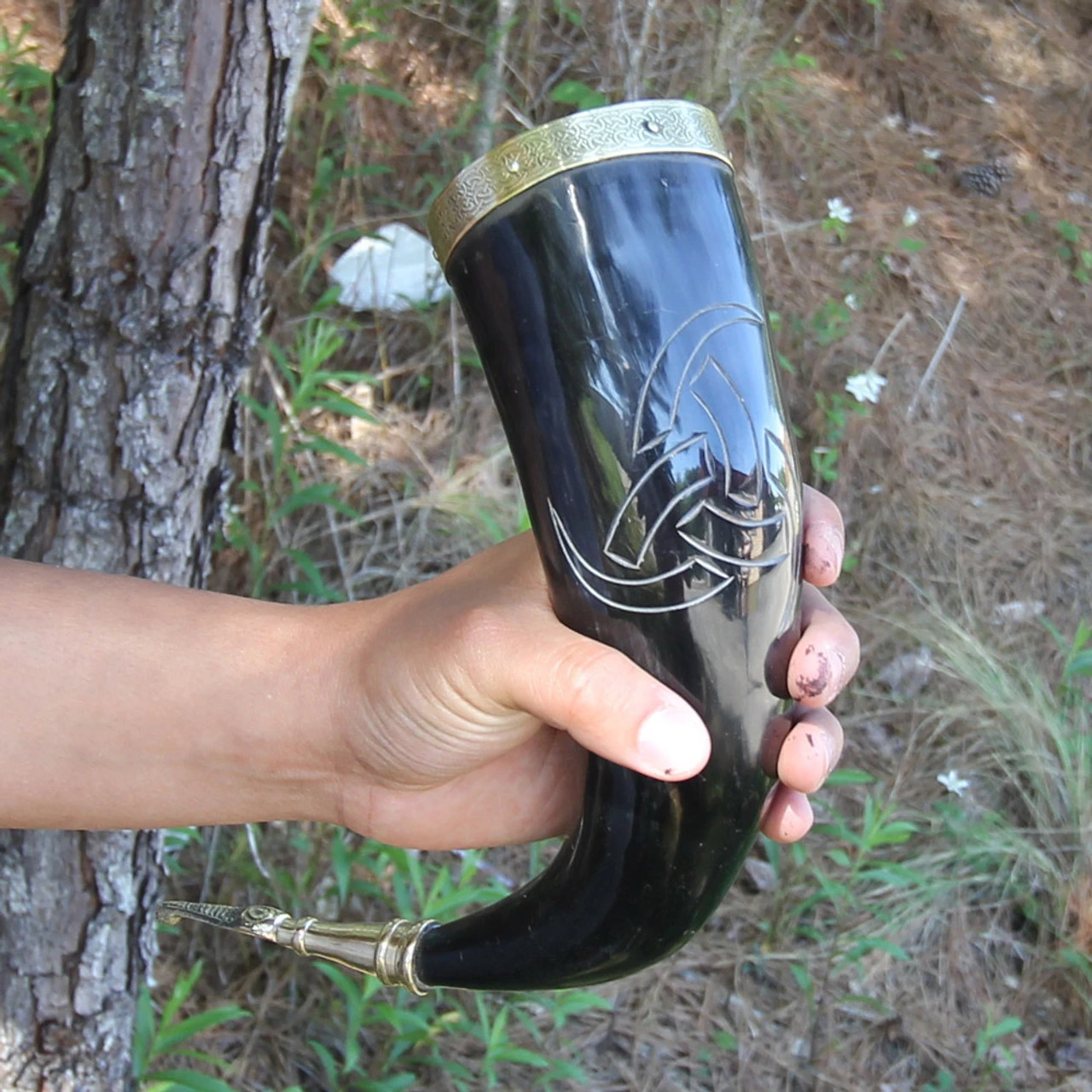 This handmade horn features and etched symbol of the Horns of Odin right on the front. This horn has been hand polished from all natural horn. The rim is lined with a brass band and pins with a Celtic weave design. The tip is also crafted from genuine brass and carved to resemble a crocodile. The inner has been hollowed out and coated with a food safe sealant. What makes these horns so unique is the all the differences in size, shape, and color. This verifies the authenticity of the piece. Horn Height (Approximate): 12-15 Inches