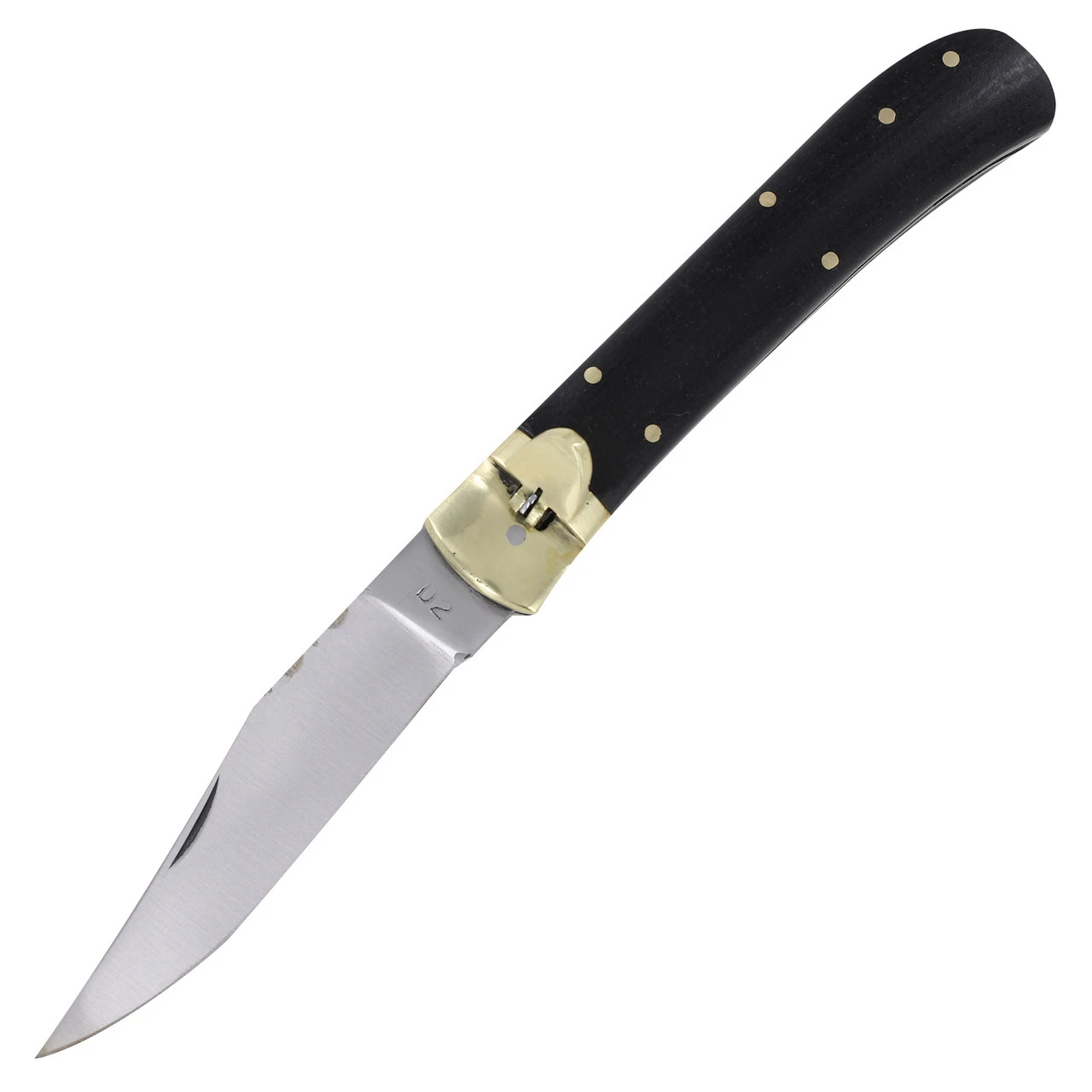 The Obsidian Resonating Clip Point Automatic Damascus Lever Lock Knife is an automatic knife with a striking matte black handle which is made of micarta composite. The blade is gorgeous stainless steel in a stunning clip point shape which compliments the semicircle grooves along the spine of the blade. These same grooves travel from the spine of the blade all the way down the spine of the handle which brings coherency to the design of this knife as well as a touch of intricate detail. The Obsidian Resonating Clip Point Automatic Damascus Lever Lock Knife features a lever lock for security when the knife is not in use. Flip the lever up and the blade will not deploy, conversely if you flip the lever down and press down on it the blade will deploy. The Obsidian Resonating Clip Point Automatic Damascus Lever Lock Knife also comes with its own genuine leather sheath for safekeeping when the knife is not in use. Overall Length: 9.2 Inches. Weight: 226.8 g.