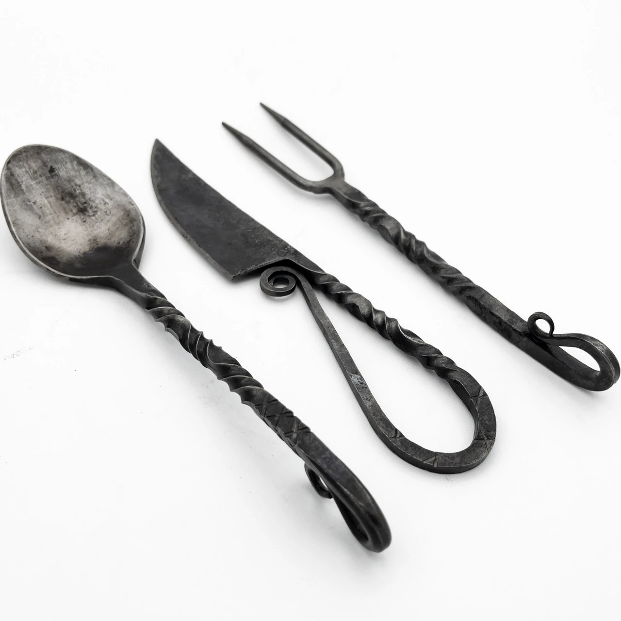 The Orange Glow 3PC Set Medieval Iron Silverware Fork, Spoon, and Knife came from the fires of the forge to rest in the orange glow from your hearth at the table. This is a three-piece set containing a fork, spoon, and a knife that are composed of forged iron. The handles of each are twisted into an elegant loop at the end and the base of the handles themselves are twisted. The loop at the end is the only part of the handle that is not twisted; instead, there are x-shaped grooves cut along the sides of the end of the handle that is flat instead of twisted. The Orange Glow 3PC Set Medieval Iron Silverware Fork, Spoon, and Knife is a full three piece cutlery set that is a breathtaking and stunning addition to any kitchen.