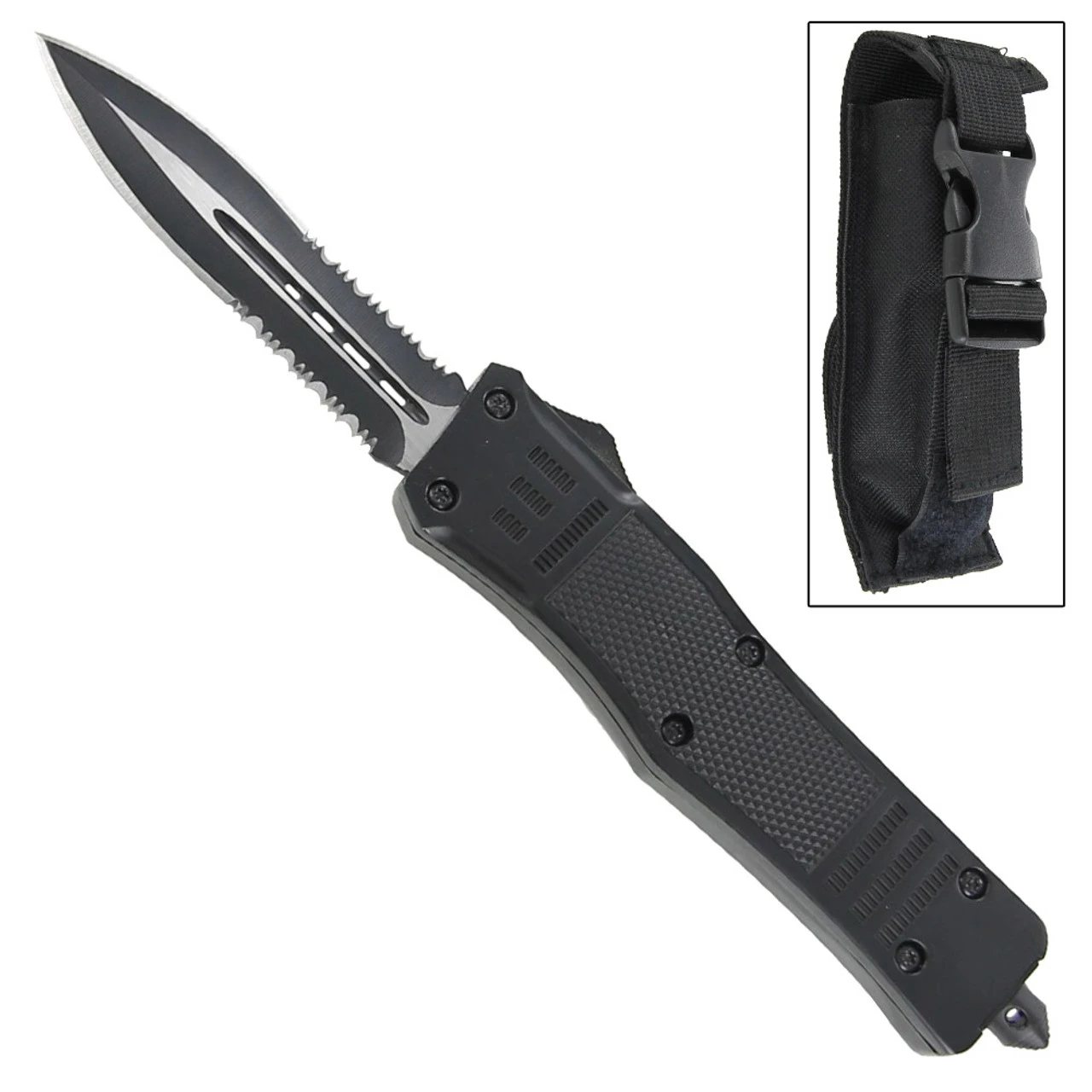 The first thing you will notice about this blade is the massive handle. Just looking at it, it demands its presence to be known. I mean it is huge. It is definitely for someone with a large grip. The handle casing is made from a durable zinc aluminum alloy and comes with a diamond grip design. This feature is great with sweaty palms or in other wet conditions. Another great feature is the glass breaker at the end. This is excellent to have in case of a car accident or burning building where you need to punch your way in fast. Plus it has a steel belt clip or you can use the durable black nylon pouch with Velcro adjustable belt loop and side release adjustable buckle. With the dual action you can eject or retract your blade with ease, just watch it fly in short quick swift motions. This stainless steel blade comes in a two tone finish with a partial serration that can be used for cutting thick ropes. This blade is exceptional for hunting, camping, every day, or military use. Overall Length: 9.5 inch, Blade Length: 3.75 inch