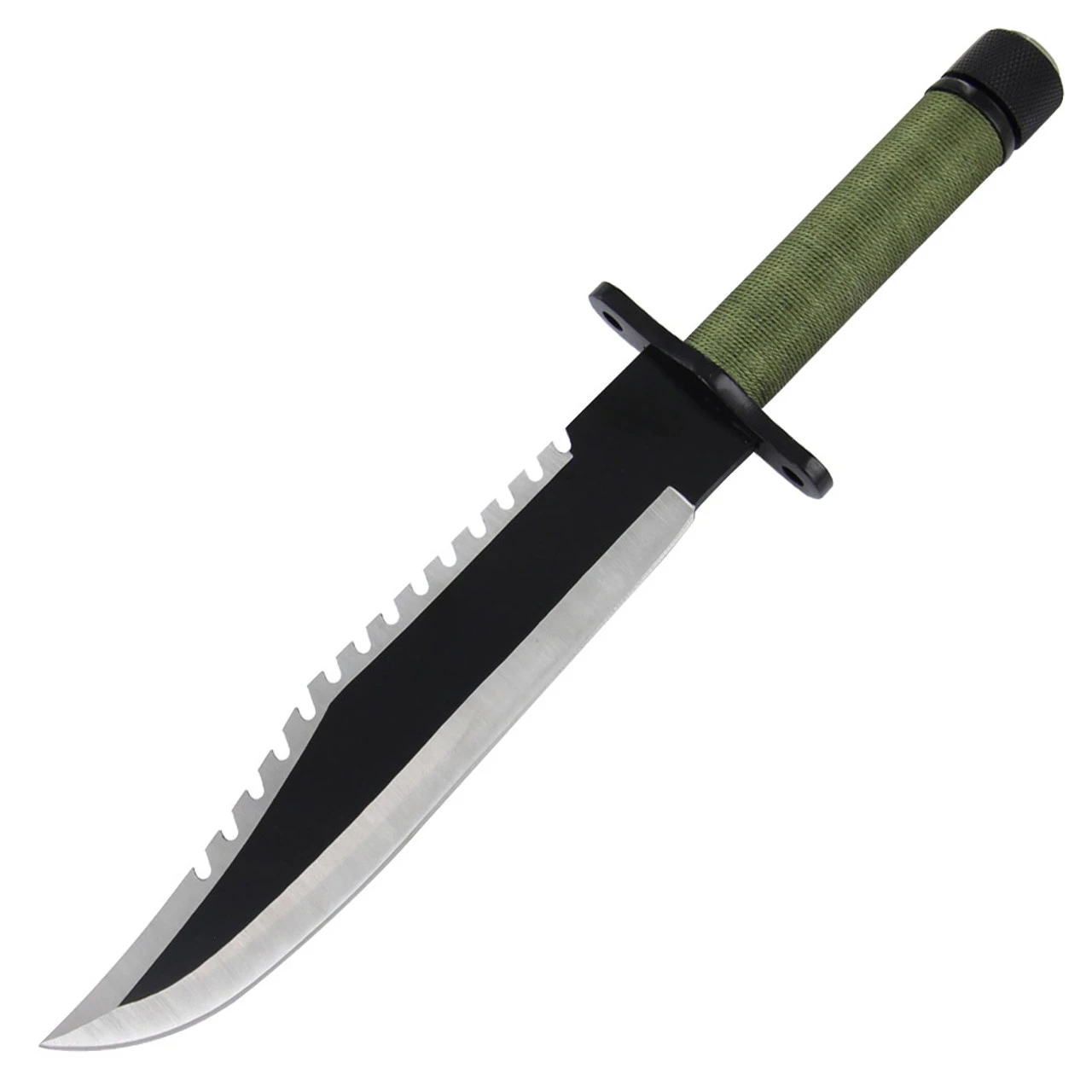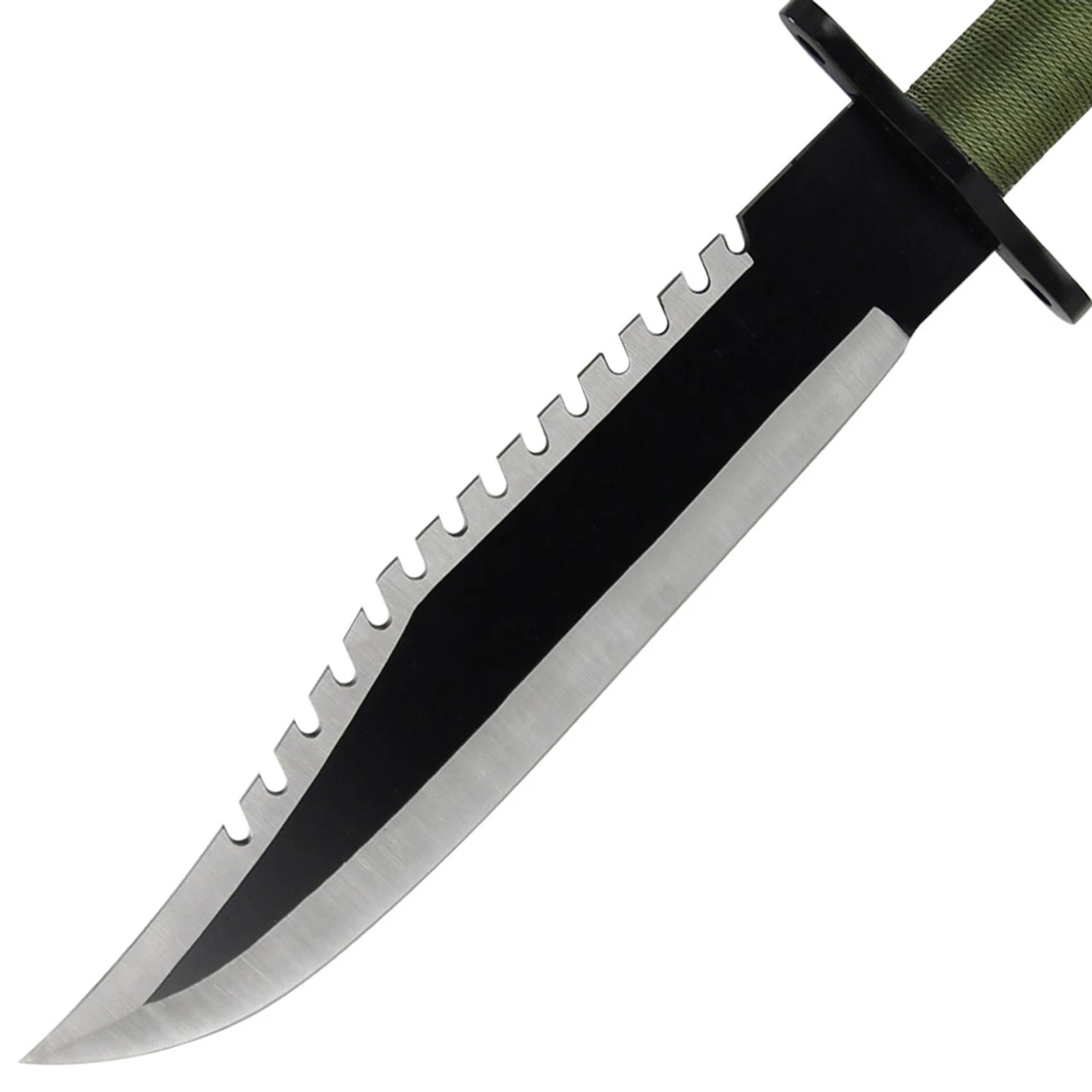 This survival knife is made from stainless steel with a two tone finish. The sawback feature is great for sawing small limbs. The clip point blade comes sharp but you may want to hone the blade to your specifications. There is a black zinc guard that measures 3 inches in length to protect the users hands. The handle has been wrapped in a green cord for comfort. The hollow handle holds a survival kit that consists of 3 matches, a striker, fish hook, fishing line, needle, and thread. The pommel is a functioning compass secured on with a water tight O-ring. The sheath to house your blade comes with a belt loop with snap closure and a lace to secure it to your pack. Overall length: 13.13 Inches.